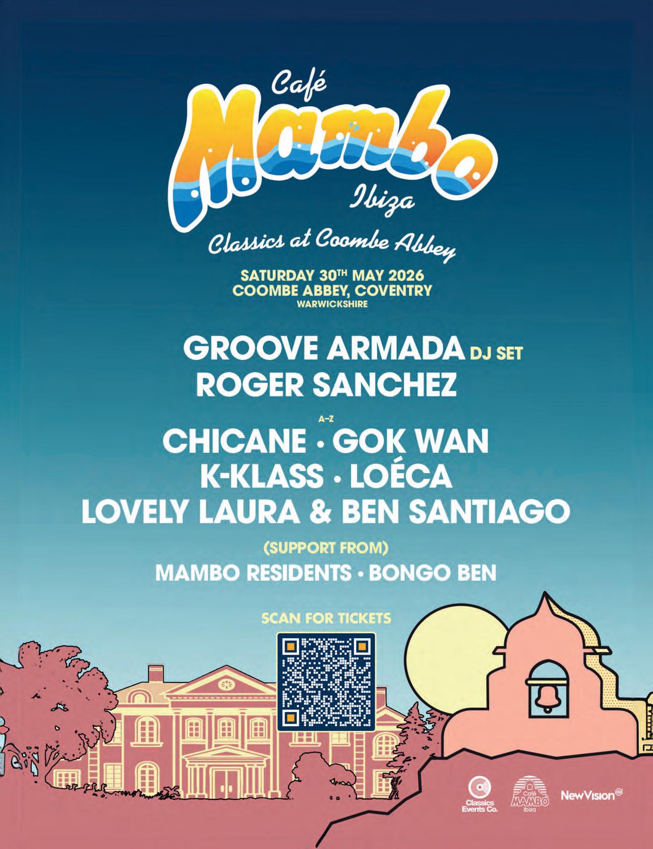 Café Mambo Ibiza Classics will return to Coventry’s Coombe Abbey in the spring (Saturday 30 May), with Grammy-nominated duo Groove Armada (DJ set) and Roger Sanchez headlining. The event will also feature contributions from Chicane, Gok Wan, K-Klass, Lovely Laura & Ben Santiago, with support from Mambo residents and Bongo Ben.