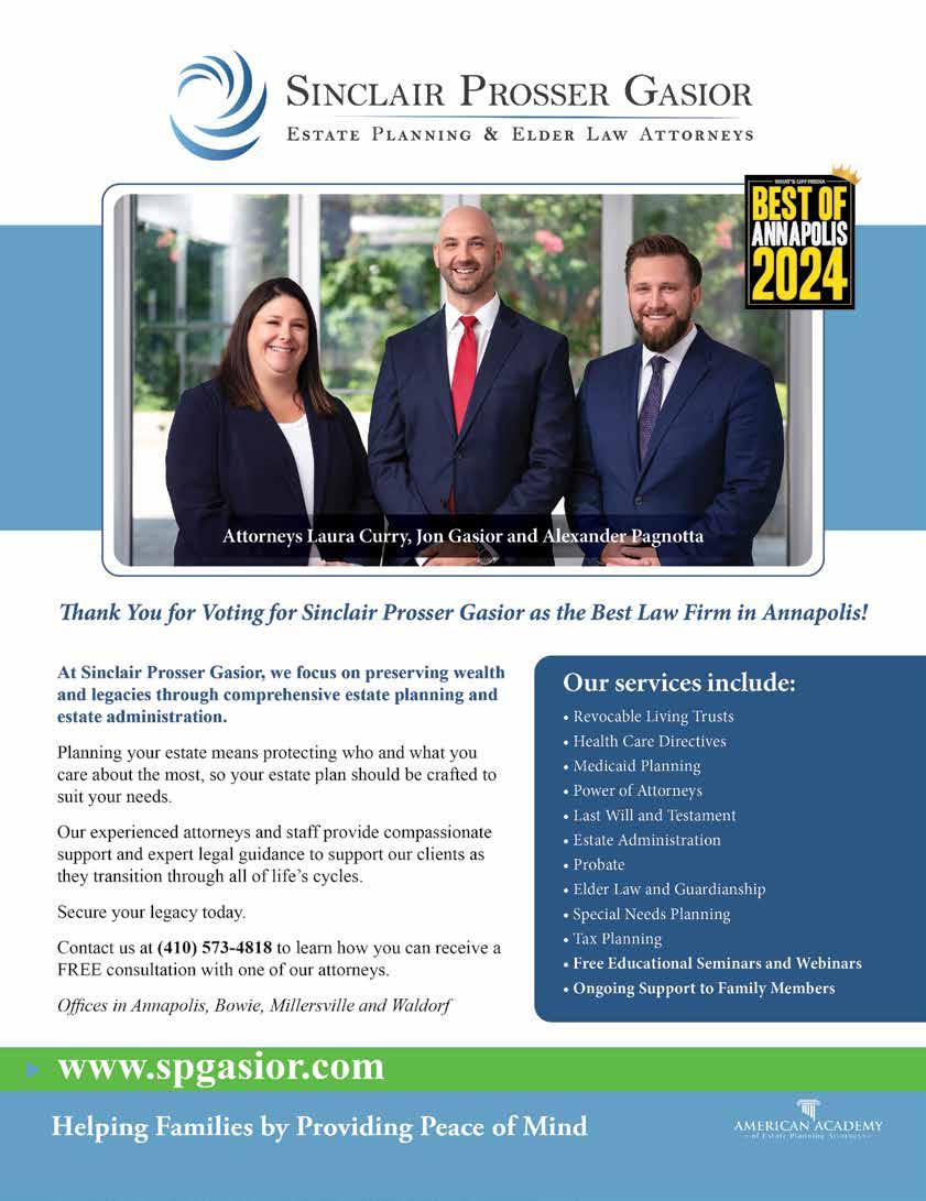 Tavern 148 HF Advisory Group 93 Hobo 90 Homestead Gardens 79 Hospice of the Chesapeake 146 ICSI 159 Indian Creek School 112 Jalapenos 148 Jesse Jay's Latin Inspired Kitchen 64 Kenwood Kitchens 82 Key School 113 Lash Moi 45 Leadership Anne Arundel 33 Lewnes' Steakhouse 157 Libbey's Coastal Kitchen + Cocktails 65 Liz Osborn 131 Long & Foster, Mr. Waterfront Team 6 Long & Foster Annapolis 10 Long Fence 118 Luminis Health AAMC 23 Lundberg Builders and 314 Design Studio 81 Mahon Plumbing 159 Main & Market 64 Maryland Hall 139 Maryland Paint & Decorating 51 Mi Lindo Cancun Grill 63 Mobile Pet Vet 72 Mueller Homes 120 Nancy Hammond Editions 126 Nielsen Development Group 33 Noreen's Boutique Spa 72 Northrop Realty, A Long & Foster Company 121 On The Green Inc 131 Osteria 177 148 Patient First 67 People Rise LLC 158 Perfect Pet Resort 88 ProMD Health 136 Rams Head on Stage 15 Rotary Club of Annapolis 66 Saint Andrews Day School 66 Sandel Duggal Center For Plastic Surgery IFC Scarborough Capital Management 47 Scott Finlay DDS & Associates 17 Sea Bags Maine 48 Sheehy Lexus 12 Shore United Bank 57 Simply Stronger 159 Sinclair Prosser Gasior 41, 87 Skin Wellness MD 14 SPCA of Anne Arundel County 90 St. Martin's In the Field Episcopal School 111 Stahley Thompson Homes 74 Taylor Hart Design 77 The Cottage Annapolis & Severna Park 90, GG The Jaklitsch Law Group 20 The Spice And Tea Exchange GG The Summit School 111 The Wellness House 145 Thrive Behavioral Health 73 Tribe Cycle 73 Tuscan Prime Italian Chophouse and Dolce Bar Monte Group 37 Wade Landscape Design, LLC 126 Werrlein Services 84 WildFlower Stem & Sundry 88 Wood Ingenuity 79 Wye Trust, Wye Financial Partners 80 Zeskinds Hardware and Millwork 83