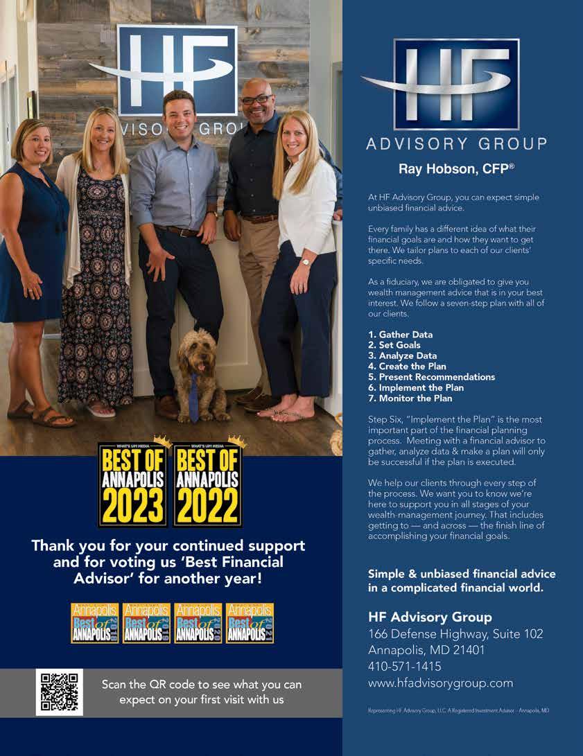 whatsupmag.com | July 2023 | What’s Up? Annapolis 13 What’s Up? Annapolis is published by What’s Up? Media 201 Defense Highway, Suite 203, Annapolis, MD 21401 410-266-6287. Fax: 410-224-4308. No part of this magazine may be reproduced in any form without express written consent of the publisher. Publisher disclaims any and all responsibility for omissions and errors. All rights reserved. Total printed circulation is 50,706 copies with an estimated readership of 164,550. ©2023 What’s Up? Media Home Grown, Locally Owned: This issue of What’s Up? Annapolis employs more than 25 local residents.