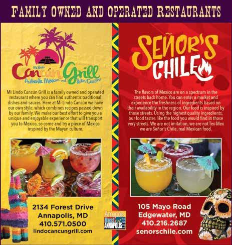 Where: 66 State Circle, Annapolis When: lunch, dinner, Sunday brunch, latenight lounge Cost: $$ Call: 410-263-4332 Click: harrybrownes. com The Scoop: Fine dining with a beautiful view of Annapolis and the State Circle landmark. Harry Browne’s has a beautiful dining room as well as a laidback bar lounge. Couple’s Dinner: Dinner for two options available to go