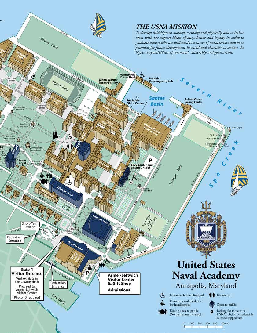 Annapolis is home to the United States Naval Academy and Naval Support Activity Annapolis. Both share many facilities and personnel. Their maps are included in this publication.