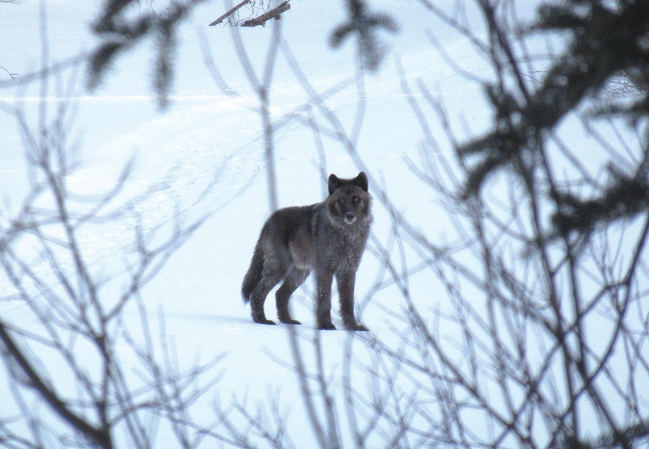 We got back to the same spot, four or five days later, and there was a big black wolf in one of the snares. Back home, we hung the big male on a scale. He weighed 101 pounds. On that account, we noticed that wolves are moving about lots: a pack might eat its fill, move on and be back two weeks later to finish off what’s left (if a wolverine hasn’t found the kill, dragging every piece of meat and bone off to bury somewhere for a later snack time).