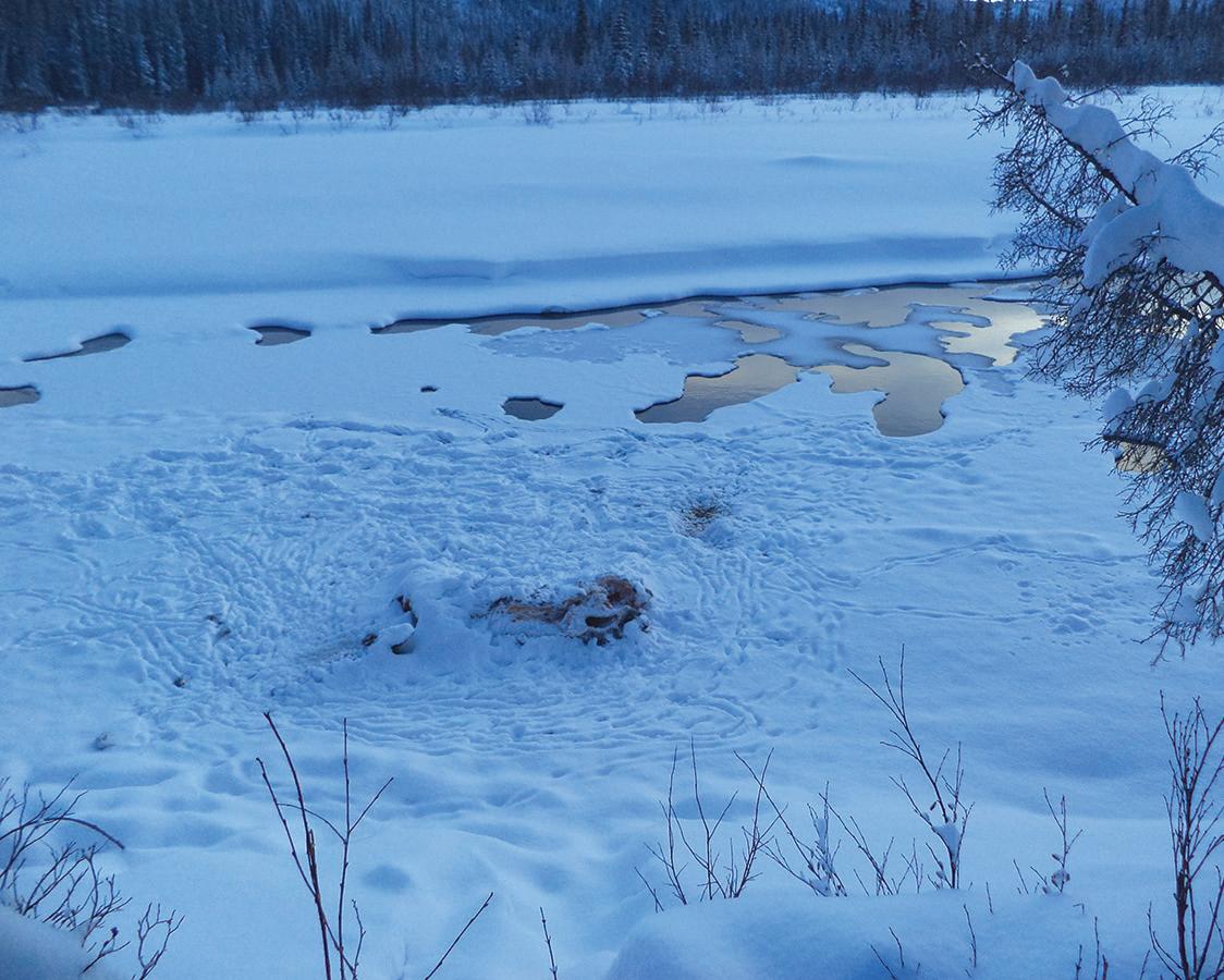 A grisly but natural sight that we spotted once was an only halfeaten moose calf carcass on the frozen river. Wolf tracks were all around and also crossing our trail in the bush. We had some wolf snares with us, so we set about five in the wolves’ paths.