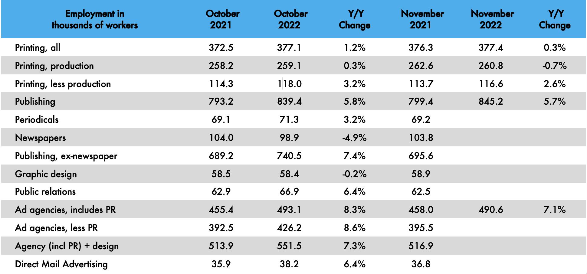 Publishing in general had a generally strong summer, but ebbed as the summer came to a close. Overall publishing employment was up +0.7% from October to November 2022, but up +5.7% from November 2021.