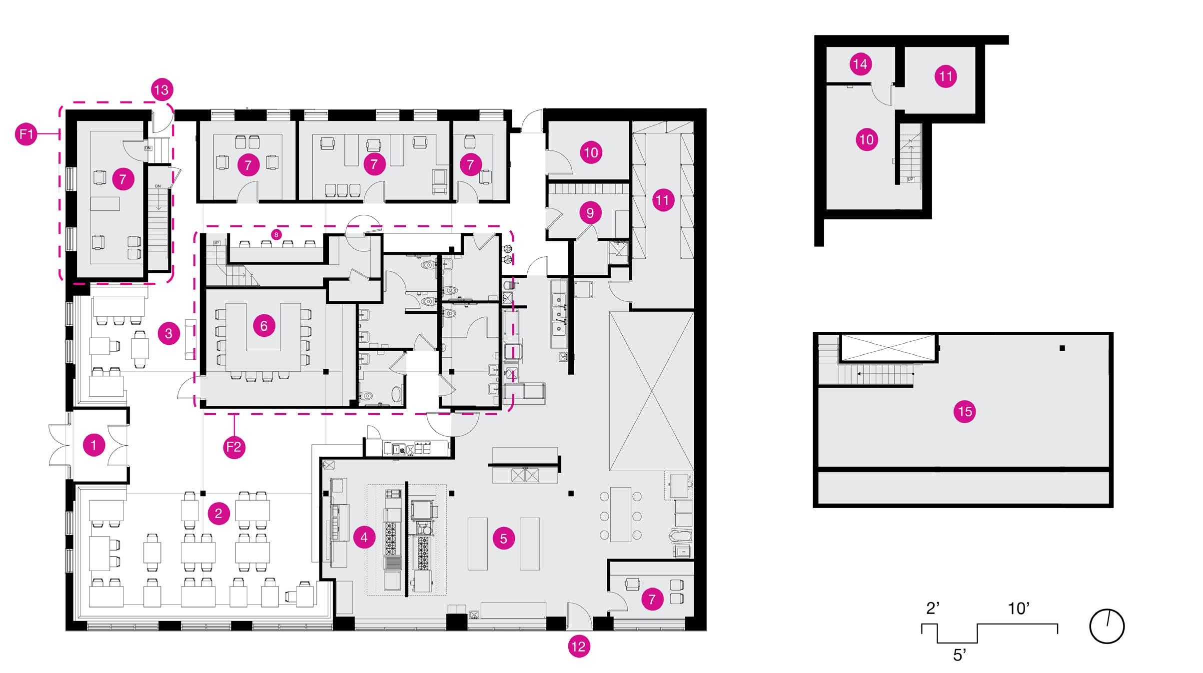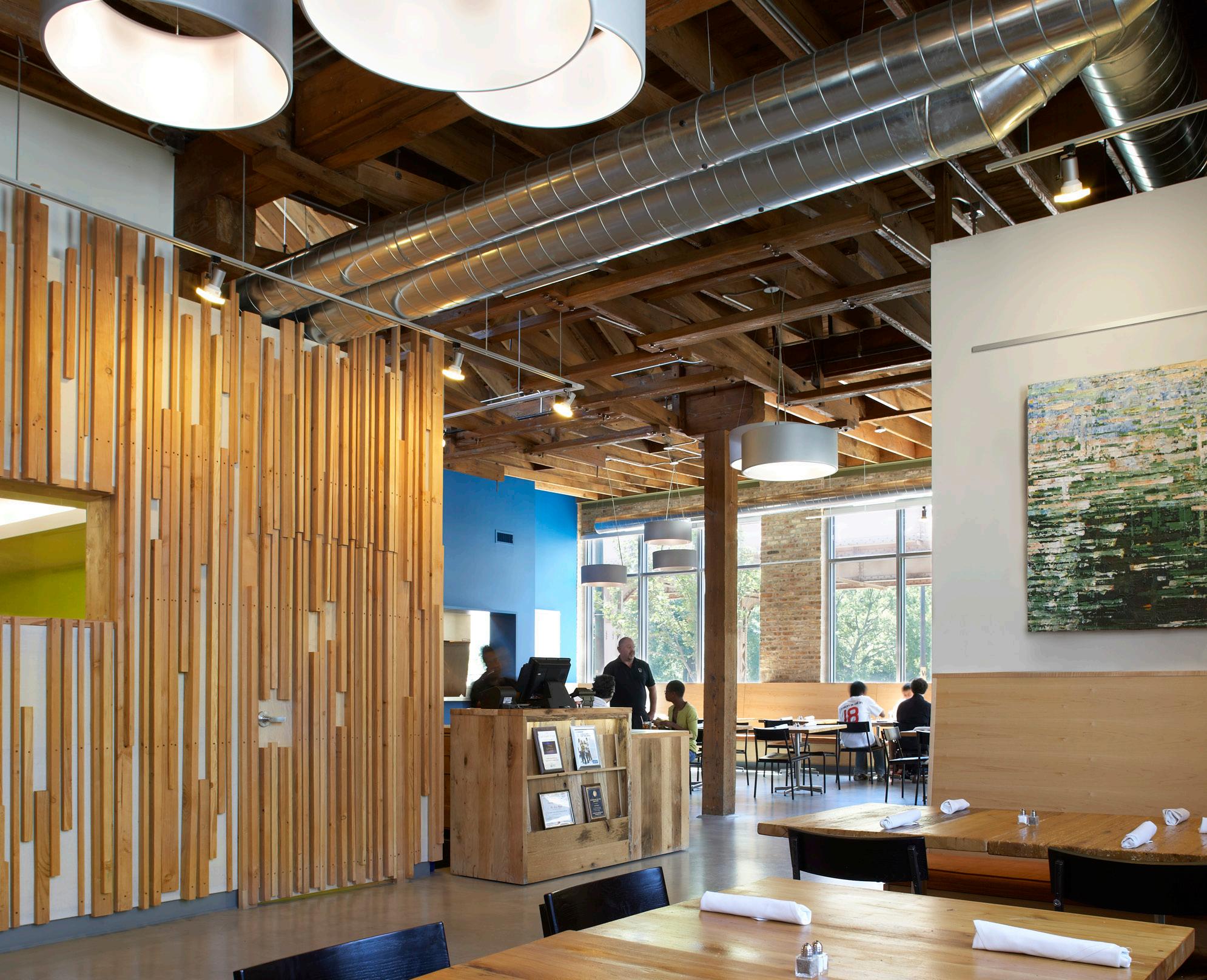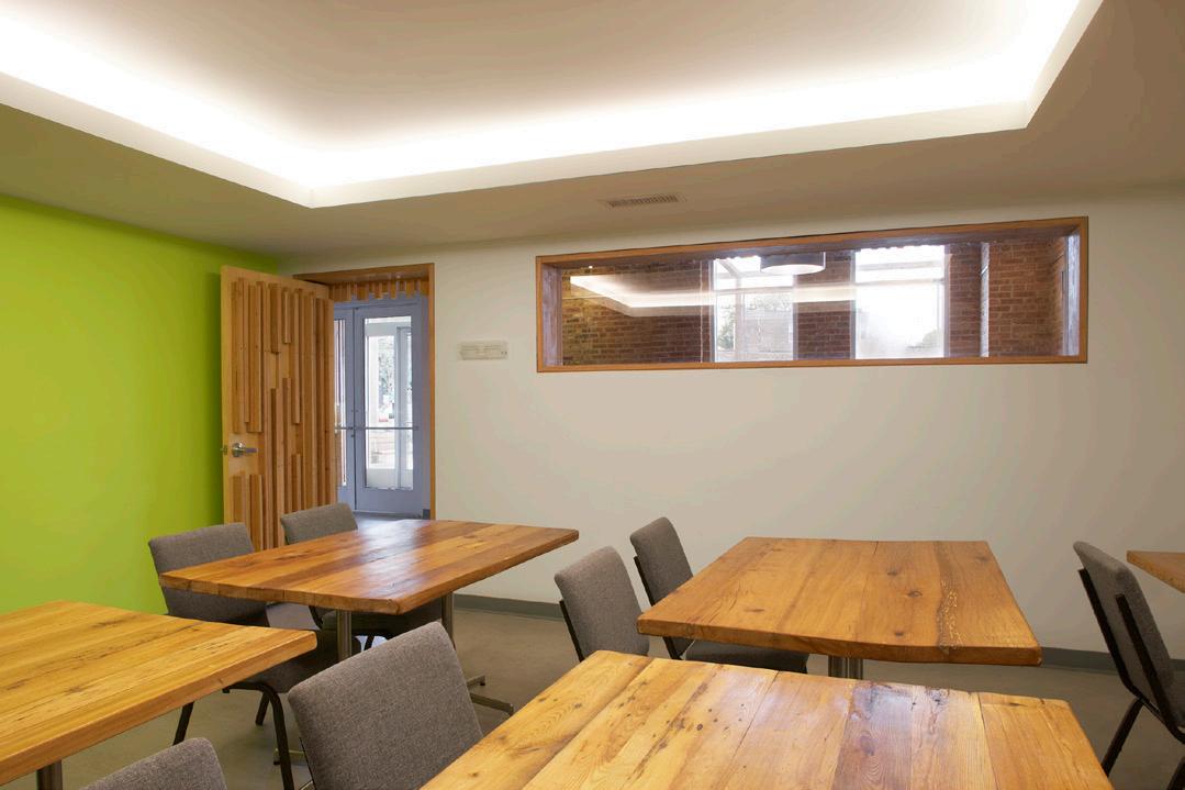 The renovated facility responds to the Inspiration Kitchens mission. An eighty seat restaurant serves subsidized meals to working poor families and market rate meals to the general public. A combination service, catering and training kitchen hosts a thirteen week food service training program. A conference room and administrative offices support the organization’s community outreach programs including case management services to students.