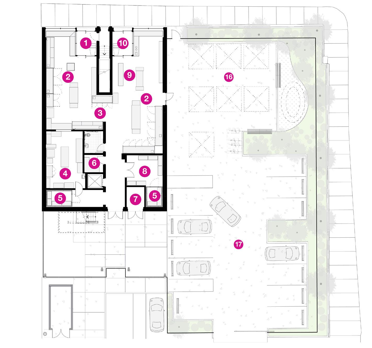 Each public entry has full glass doors and aligns with the punched openings of the central production space