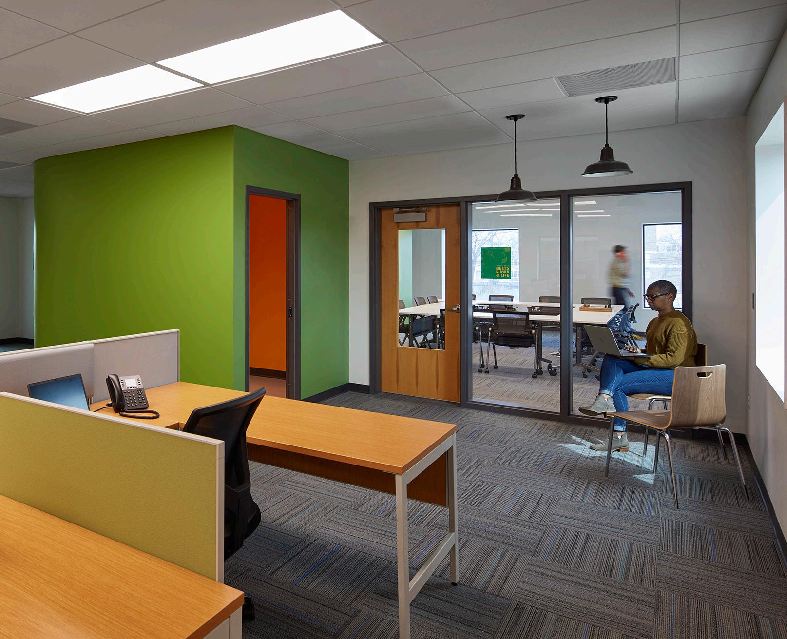 At the outermost layer, the building celebrates unique voices coming together in the spirit of community. The façade is composed of a patchwork of large masonry panels with varying shades of brick color and coursing that wrap around and knit the building together like a quilt. Inside, the new facility acknowledges that each person who enters is on a unique journey and supports them with an environment where they can experience joy, love, and acceptance. Spaces are designed to be warm, welcoming, and safe for young people to express themselves.