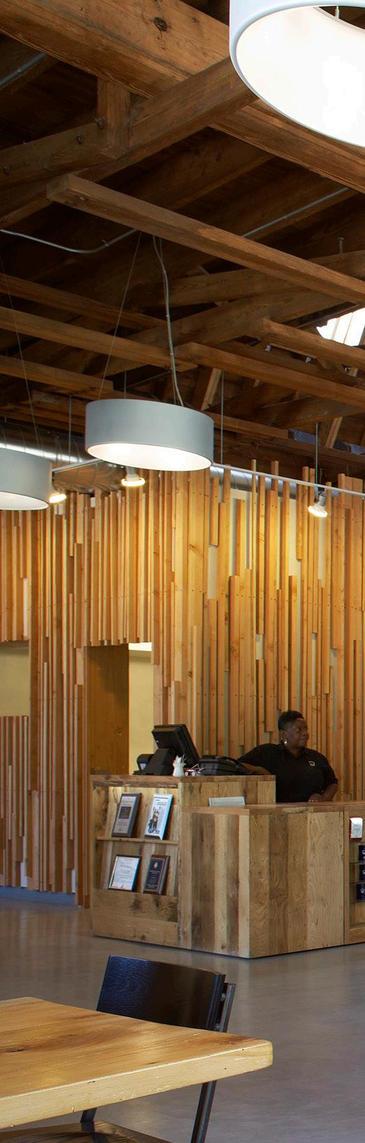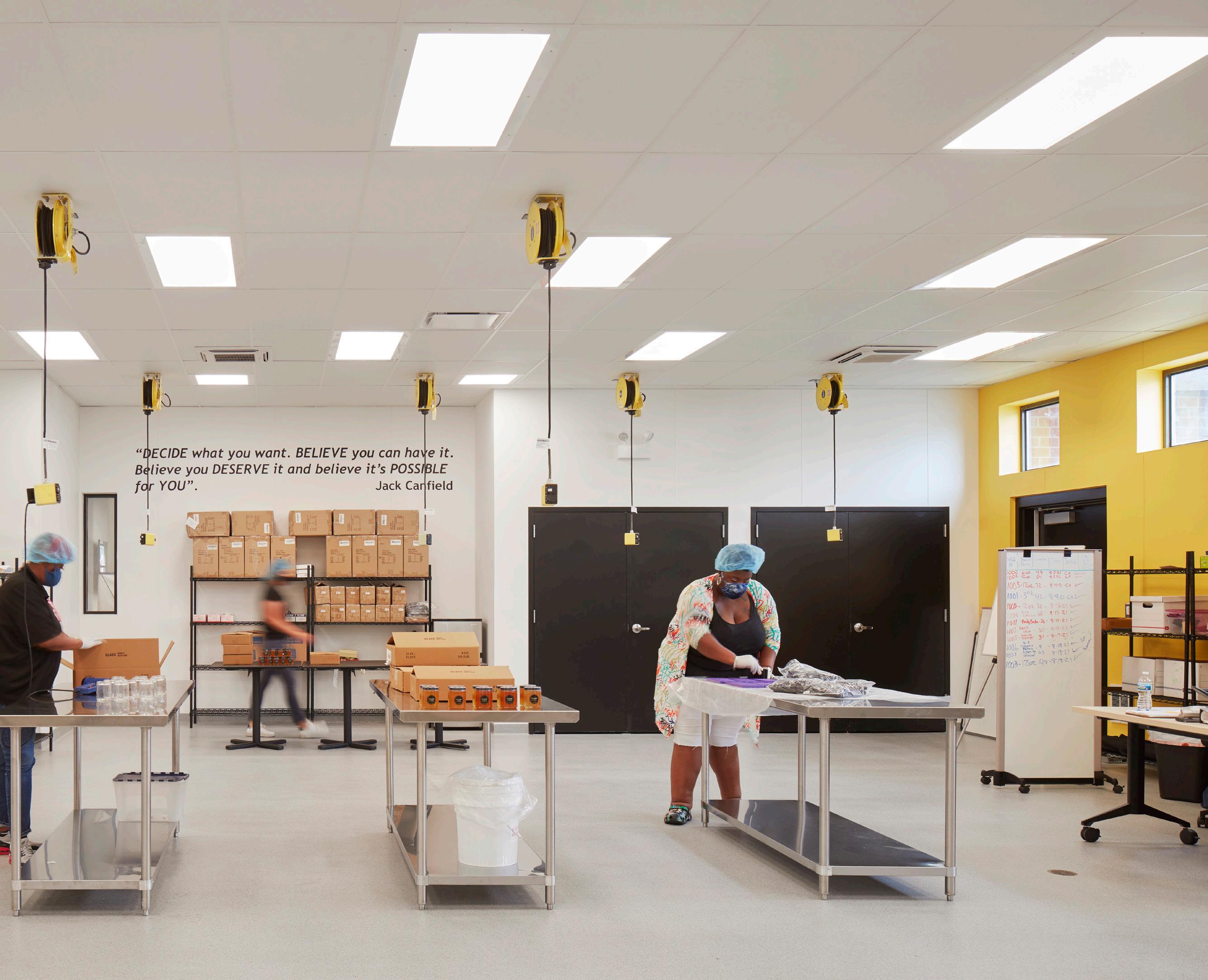 Inside, the program includes a café, administrative offices, training rooms, a computer lab, a local bank, and a community event space with a private peace garden. At the heart of the building, the organization celebrates its most important asset, its clients. The production space for Sweet Beginnings, an urban apiary enterprise, radiates from the center—with peek-through windows that display the work taking place, and prove that the opportunity to change is not only possible, it is already happening and worth the investment.