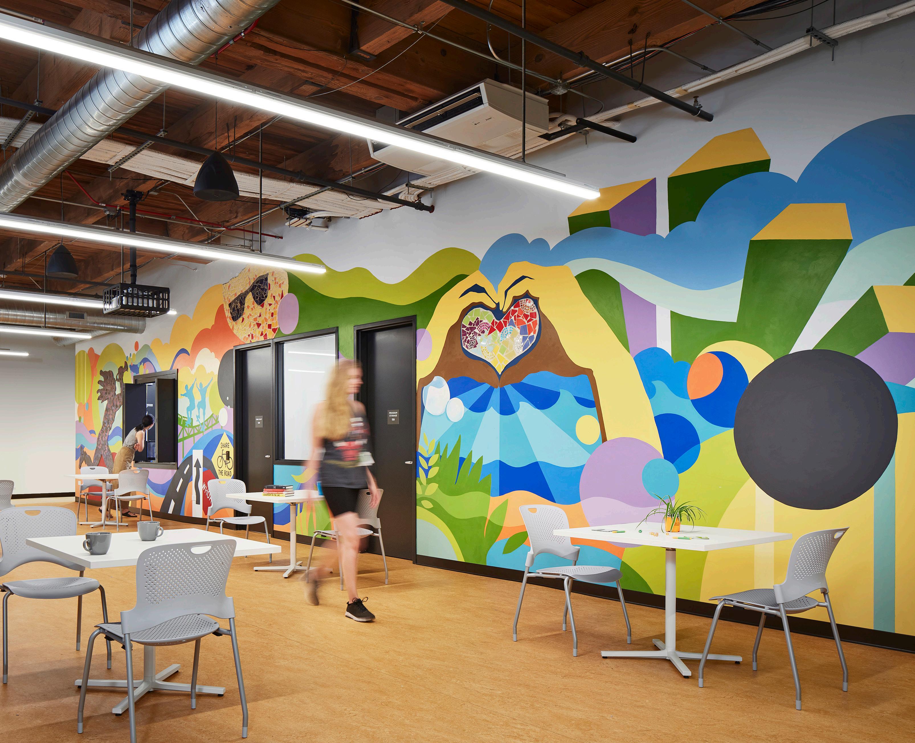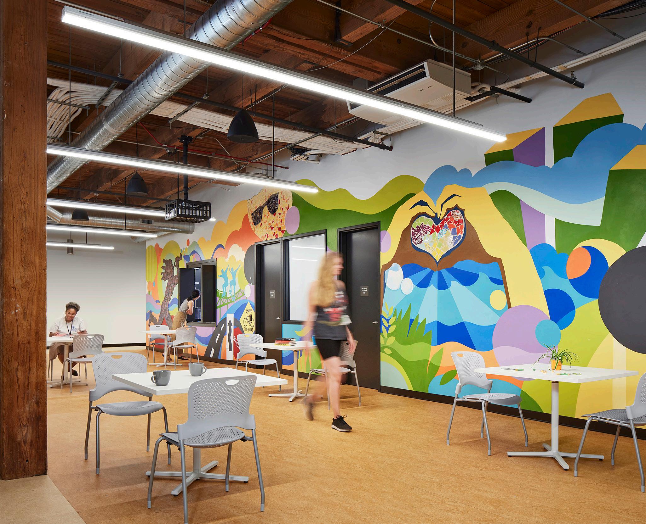 Throughout the organization’s interior spaces, painted murals complement the building’s exterior signage. These feature walls, commissioned by local Chicago art students, will eventually fill each floor with richness and color, conveying the organization’s values of refuge, safety, and healing.