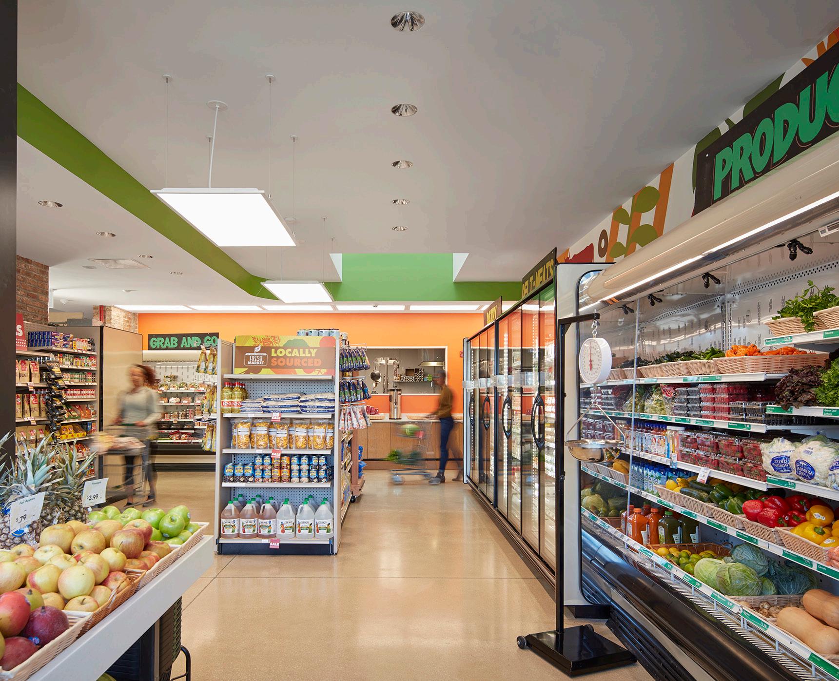 Through large new storefront windows and familiar corner store lighting, the Fresh Market welcomes and generates interest while reassuring customers that the experience is not out of reach. Inside, West African fabrics were used to develop a color palette, signaling this isn’t a generic high-end grocery; it is by and for Englewood. Above the store, training and conference room space is available for classes on healthy food choices or food prep. The acquisition of the open lot to the east of the building will expand what the Fresh Market can provide, including outdoor landscaped community space for events and creating a community garden space.