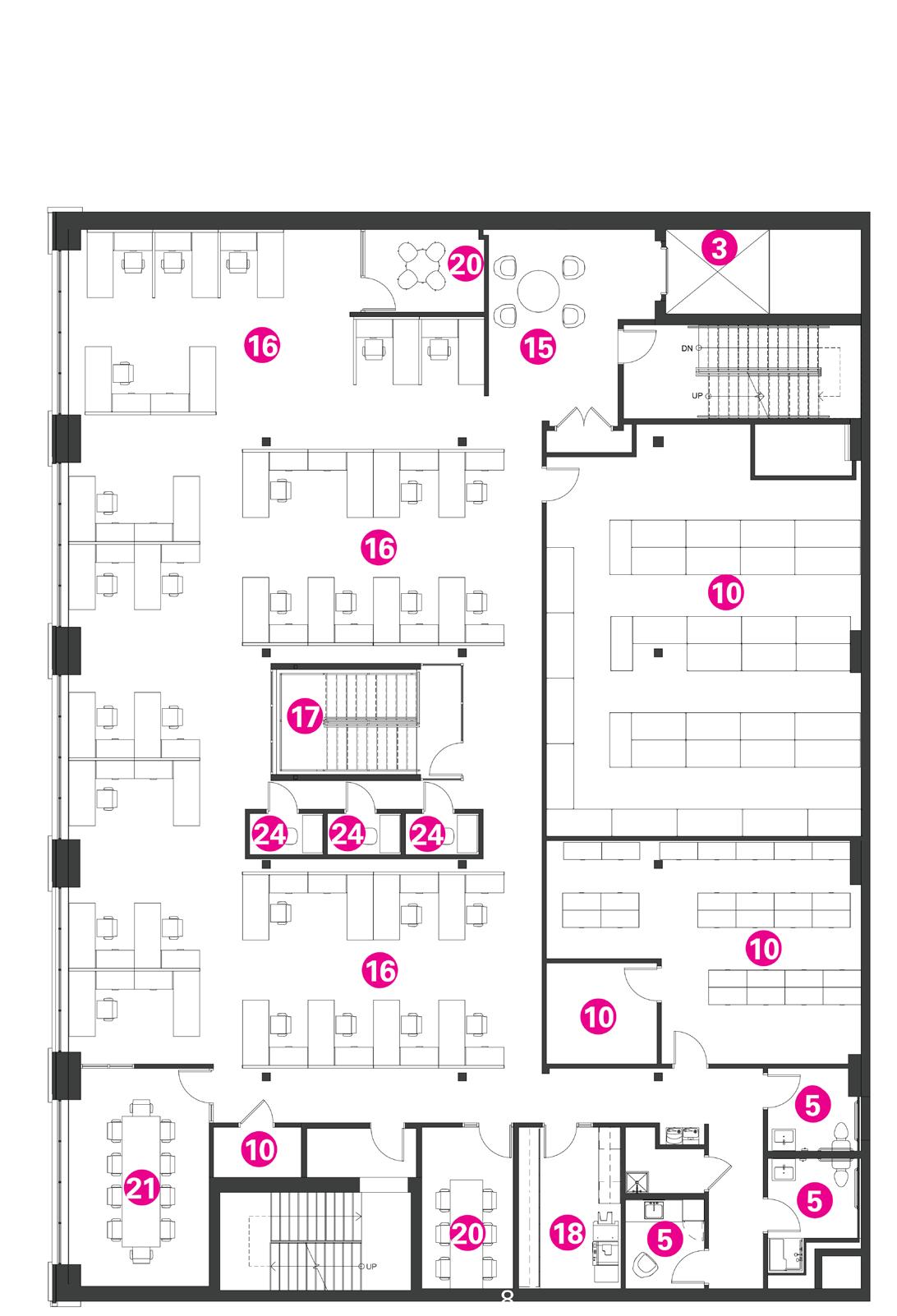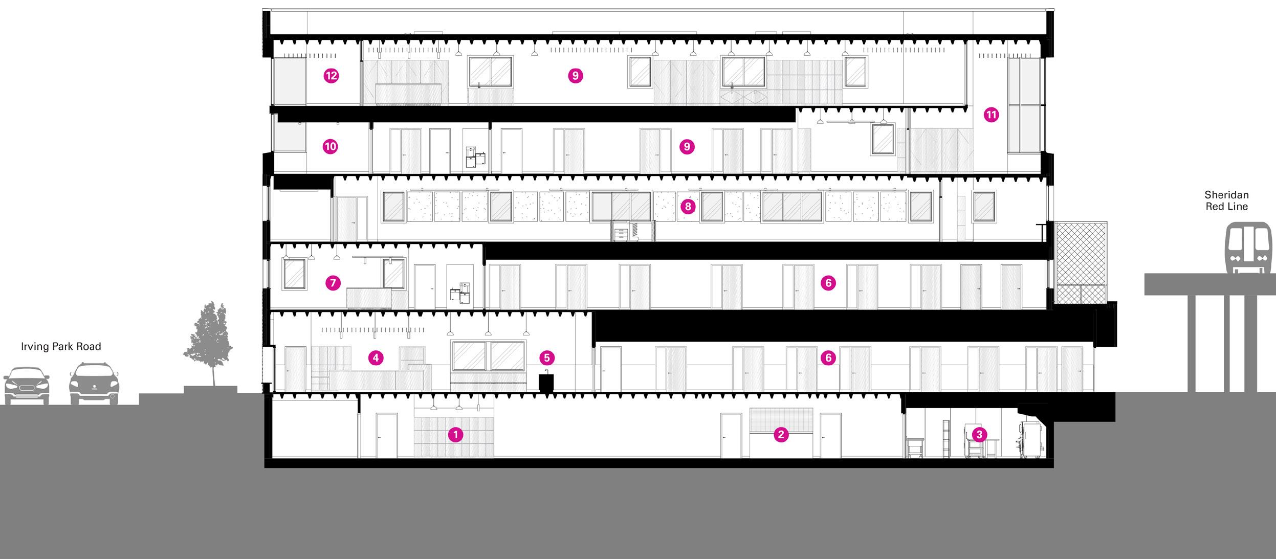The new headquarters is located in the “Mural Building” – a prominent manufacturing building known for its large murals that cover the North, East, and South elevations along a busy Chicago expressway. Three floors of the 1910 heavytimber building are renovated for The Night Ministry’s new headquarters which includes: “The Crib” – an overnight shelter for young adults ages 18-24, a serving kitchen and dining space, administrative offices, meeting rooms, and multipurpose programming space for social services, job assistance, and social activities.