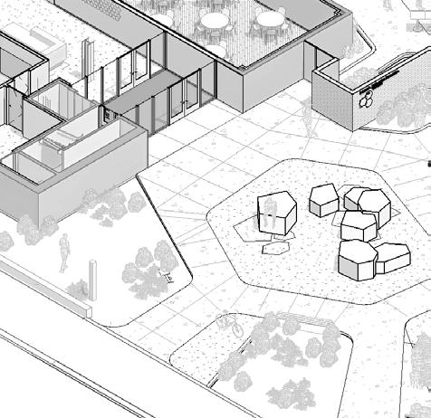 A new entrance plaza, converted from a former parking lot, is populated with native plantings and ample seating, and offers much-needed community green space.