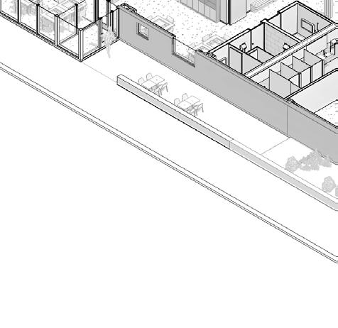 A new private entrance has been established for The Crib, reinforcing its mission of security, inclusion, and safety. Located on the North side of the building, a former loading dock with a large awning above is transformed into an accessible entrance, sheltered, and protected from the street. Here and throughout, glass doors and windows are used as critical elements to build trust, allowing guests to glimpse inside before entering, and further alleviating any feelings of stress or helplessness that they may be experiencing.