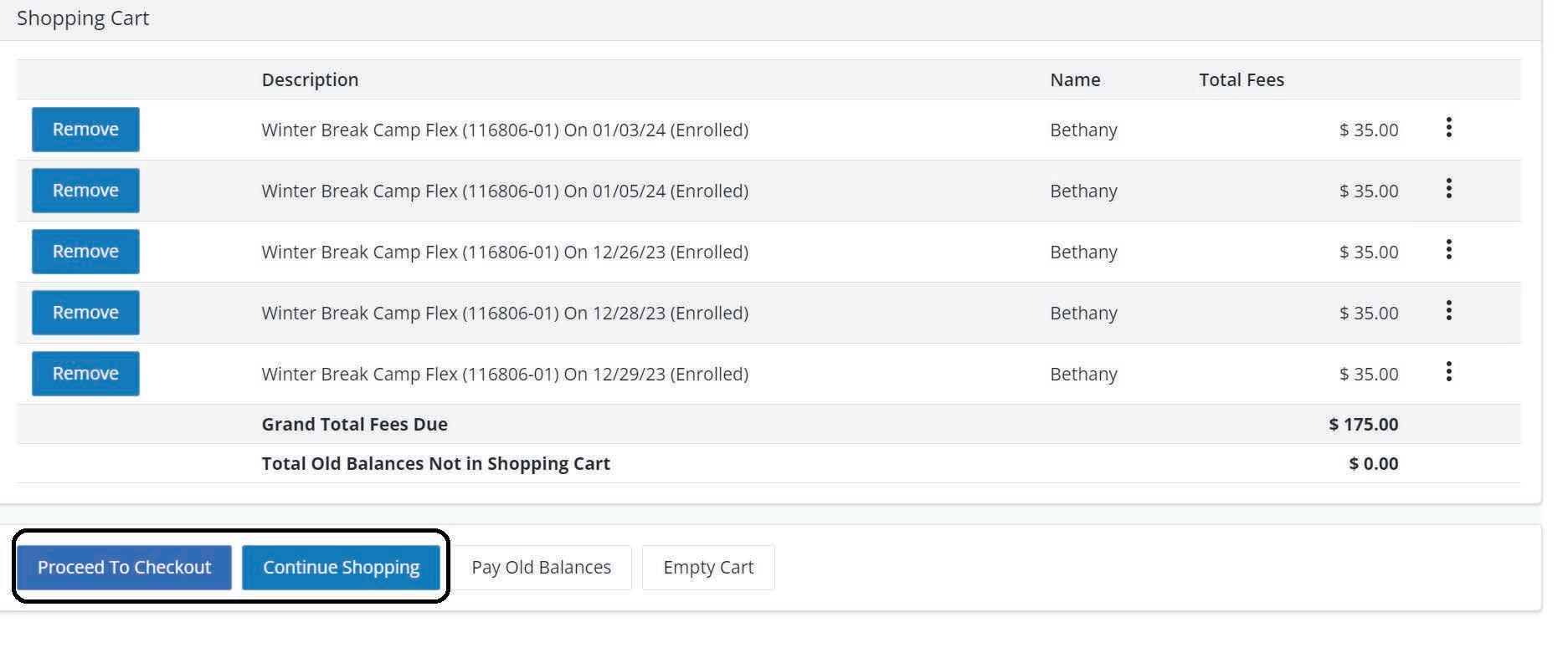 Step 7: The days you are registering each participant for will appear in your shopping cart. To add more camps, select Continue Shopping. If done shopping, click Checkout.