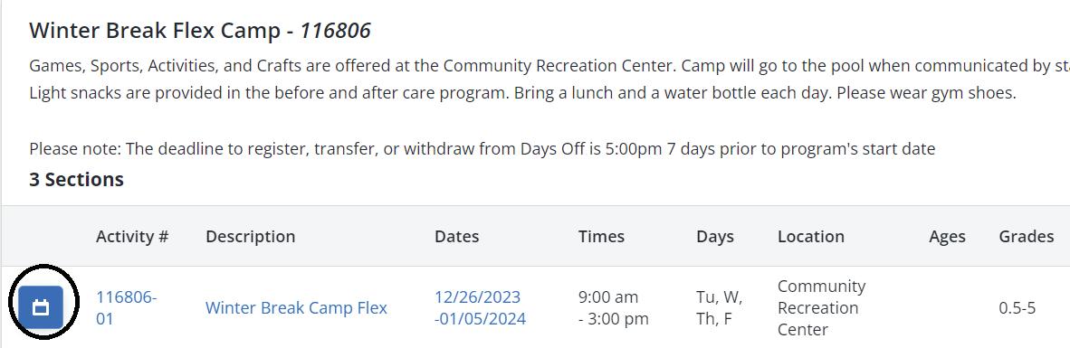 Flex Camps Option: Select the “Go To Calendar” to bring up the dates for the camp you are choosing.