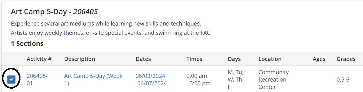 Step 4: 5-Day Camps Option: Select the Checkbox(es) then select the “Add to Cart” from the bottom pop-up. Skip to Step 7.