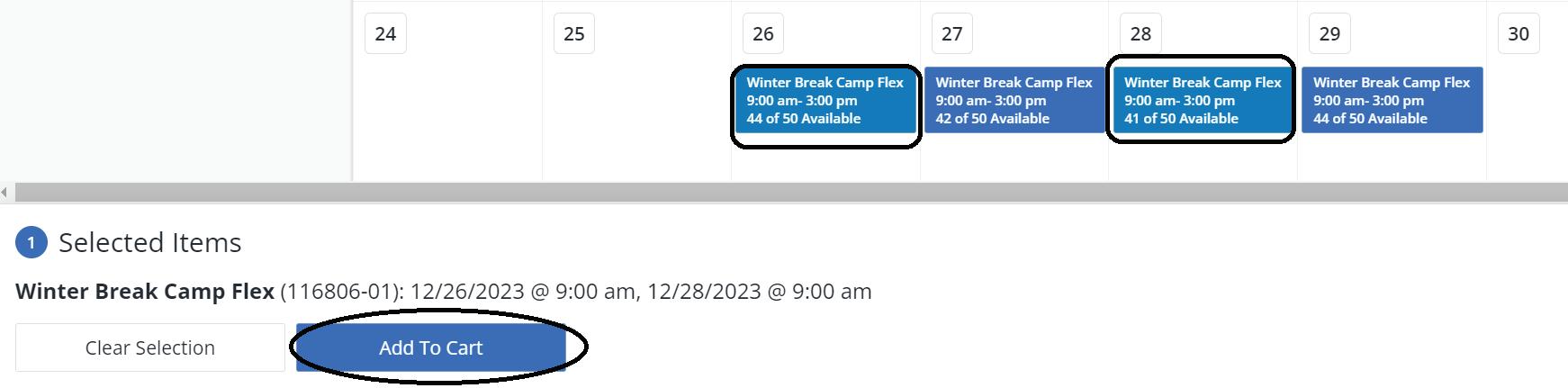 Select the dates the camper will be attending. All selected options will pop up at the bottom of the screen. Once you finish selecting all days for that camp, click on “Add to Cart” at the bottom of the screen.