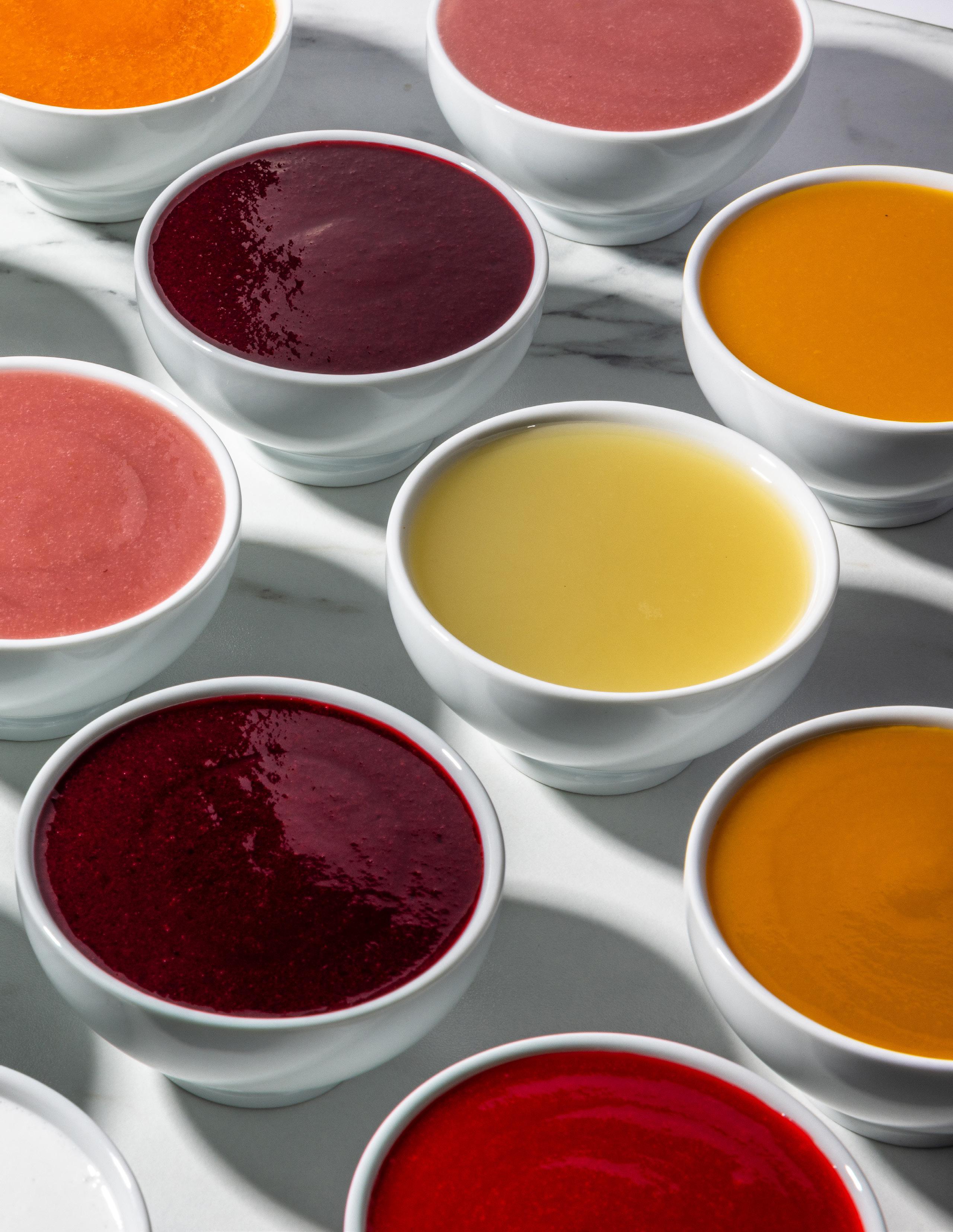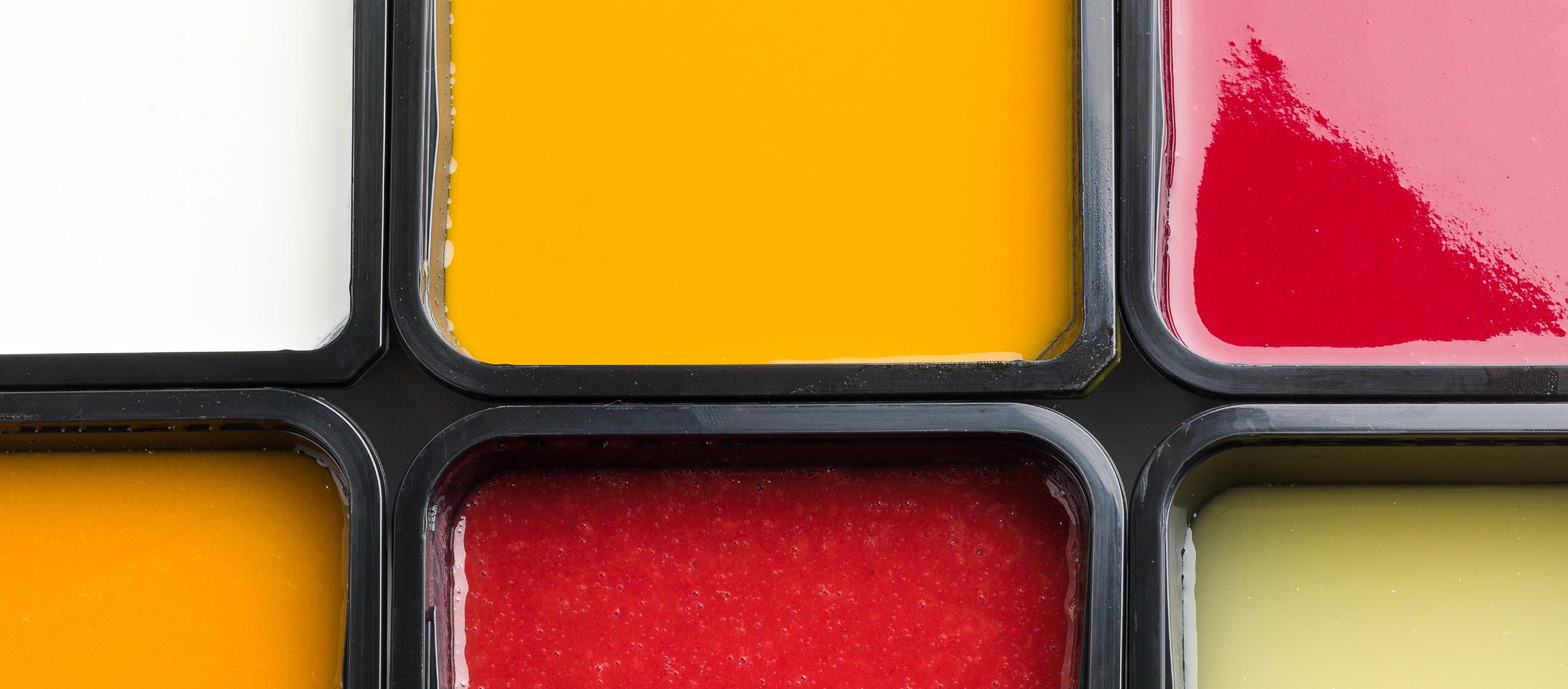 • Combine liquids together (concentrate, purée, water, cream) with sugars (invert sugar glucose and sorbitol) and eventually the citrus grated and heat until 40°C or until sugars melted.