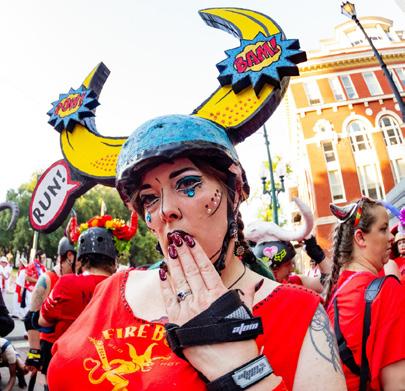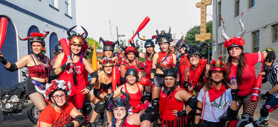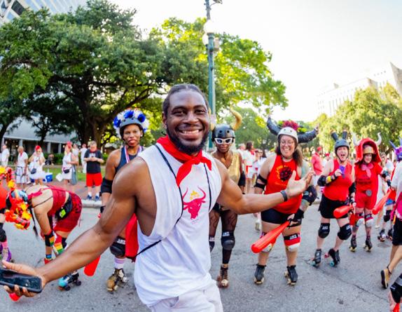 The Running of the Bulls, literally, hits the streets of New Orleans every July. This uniquely entertaining event draws its inspiration from the original event in Pamplona, Spain. San Fermin en Nueva Orleans has a flock of derby skaters—instead of bulls—on roller skates traveling through the city armed with foamfilled plastic bats, which brings a crazy twist for