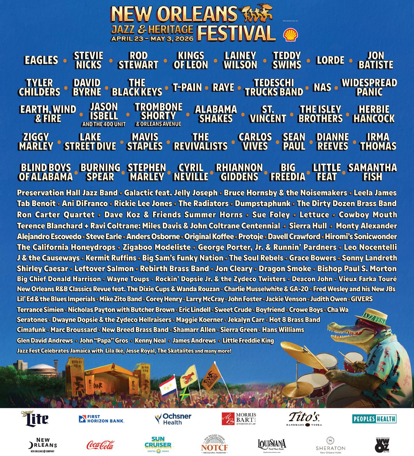 The Festival International de Louisiane is one of the country’s largest free music and arts celebrations, which features world music on several stages, global food options, handcrafted art, plenty of dancing, and familyoriented activities. 2026 marks the festival’s 40th anniversary.
