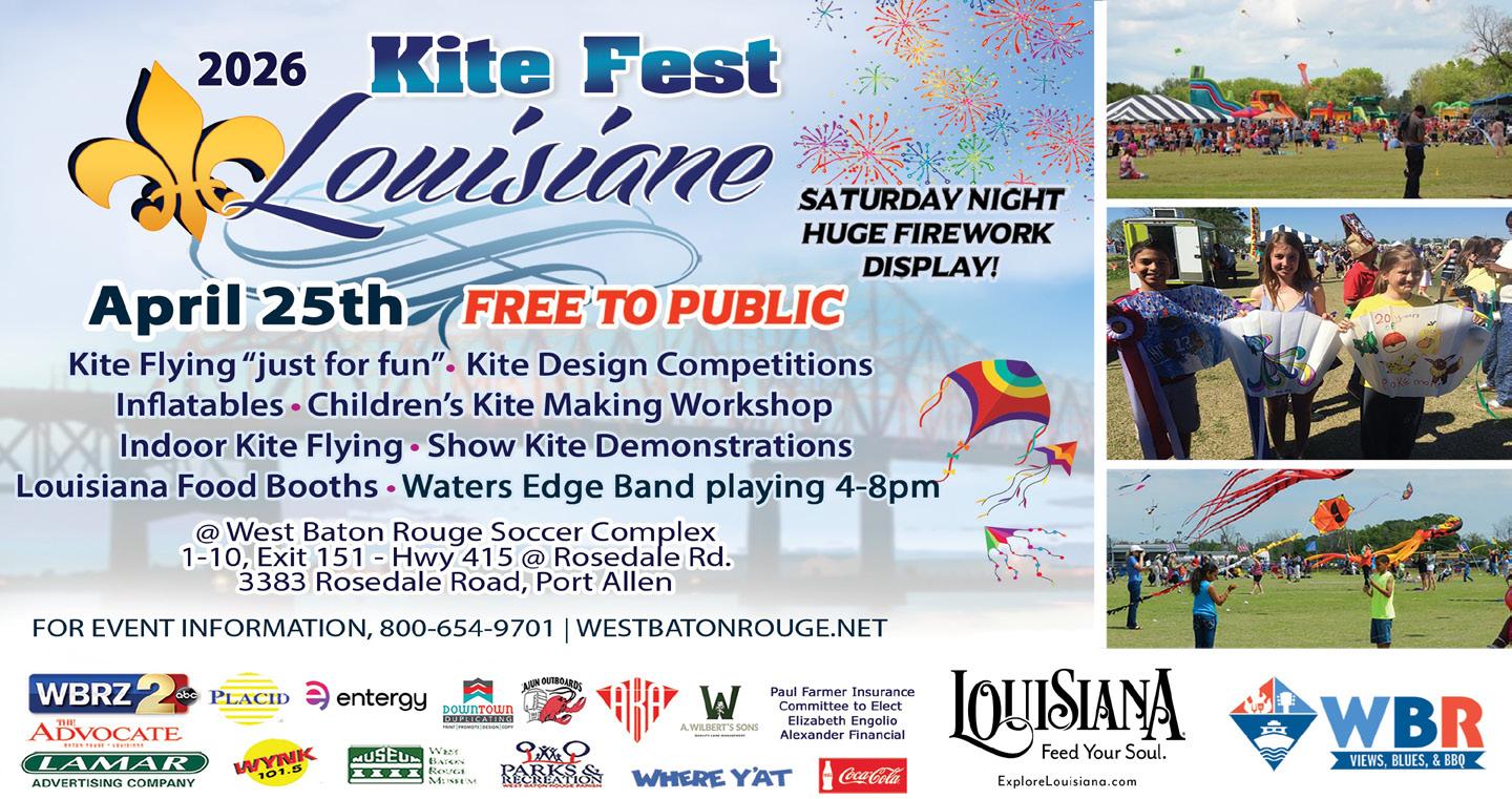 West Baton Rouge | westbatonrouge.net/kite-fest-louisiane Kite Fest Louisiane' features colorful, unique kites flown by recreational fliers and professionals, alongside fireworks, food trucks, live music, and family-friendly activities. Children and adults can enjoy kite-flying demonstrations, workshops, contests, and vendor booths on the West Baton Rouge riverfront.