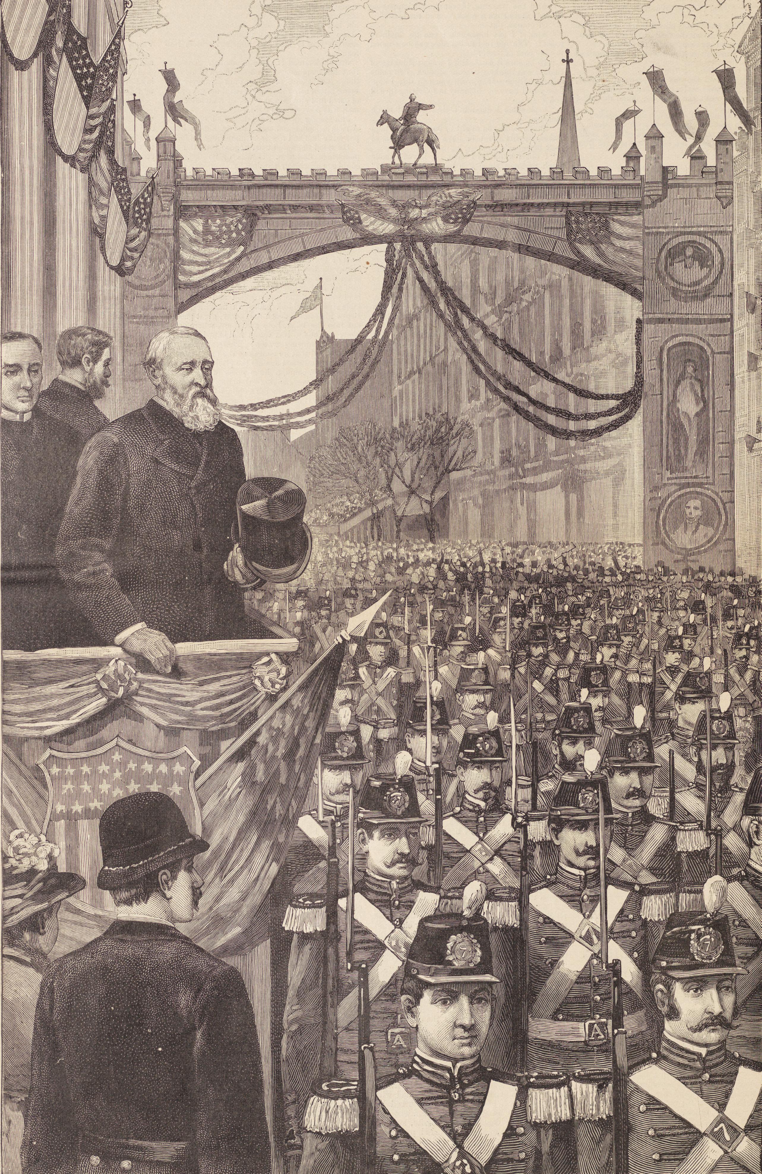 Early that afternoon, President Harrison, joined by former Presidents Hayes and Cleveland, made their way to the reviewing stand on Madison Square for a military parade. According to the New York Times, crowds began to gather at 8:00 a.m. that morning, and by 10:00 a.m. more than two-thirds of the eight thousand seats were filled.2 As the presidential party made its way to the reviewing stand, “the cheers and enthusiasm of the people were overwhelming.” The parade itself included 49,861 marchers, most of whom were uniformed troops, which “wheeled into columns” as the parade began. “The regular army on the right, followed by the navy and marines, and then the troops of the several States as they originally entered the Union, while the left of the column was held by the Veterans of the Grand Army of the Republic.” The New York Times described the contagious enthusiasm of the great spectacle: