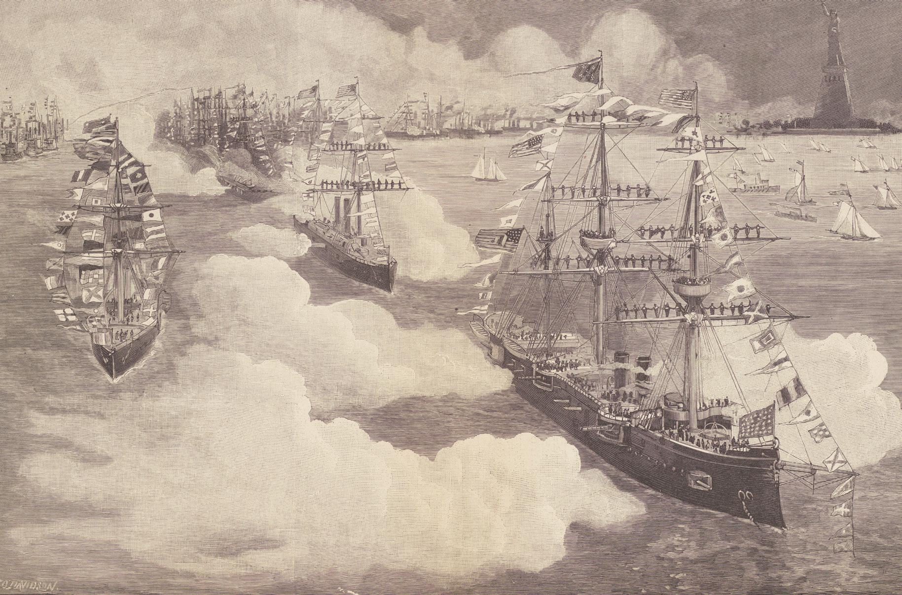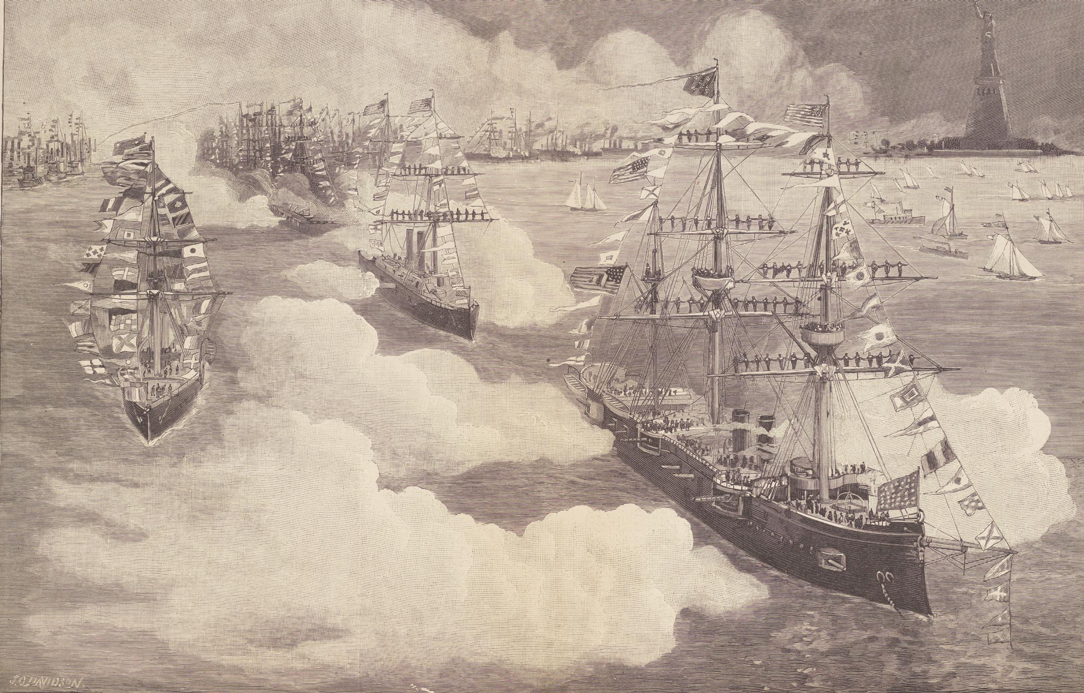 The USS Despatch carrying President Harrison navigates through a fleet of naval and merchant marine ships toward New York City. The Statue of Liberty seen at top right, had been erected just three years earlier, in 1886.