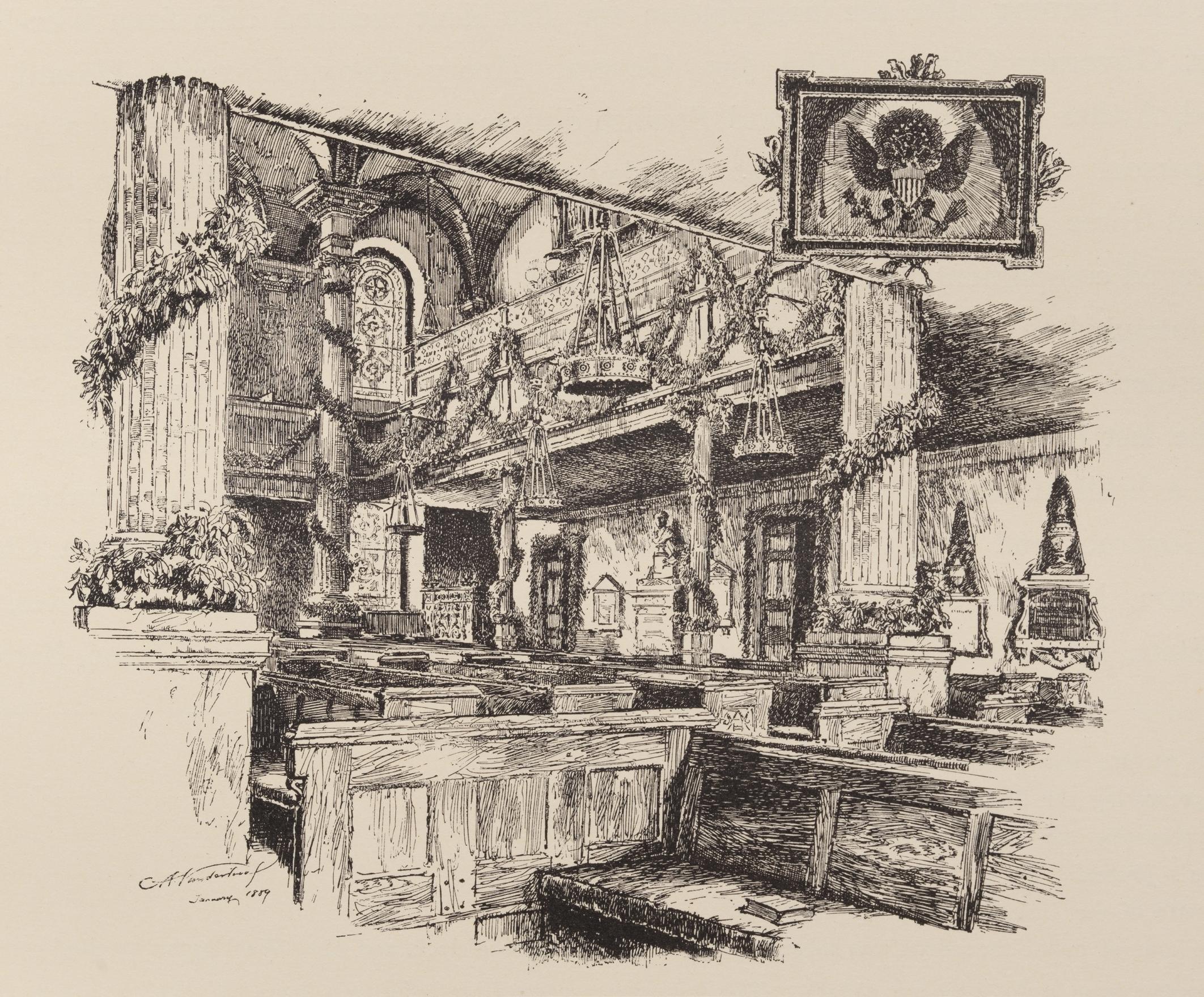 Centennial day opened with services at St. Paul’s Chapel, the same chapel where Washington attended services on his Inauguration Day. President Harrison sat with the vice president in the same pew Washington had used one hundred years prior. Former presidents Rutherford B. Hayes and Grover Cleveland also attended the service. Much like the rest of the centennial celebration, the church service featured beautiful displays of patriotism with flower arrangements, golden eagles, and flags, the most interesting being “two large crossed flags on the choir gallery, facing the chancel, one being the national flag as used a hundred years