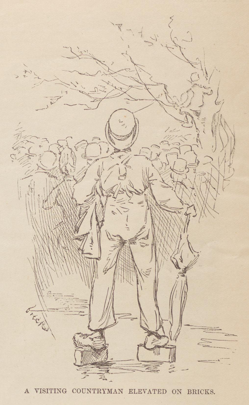 Among the many illustrations included in Frank Leslie’s May 11, 1889, issue are scenes from the enormous five hour military parade that President Harrison reviewed from Madison Square. The paper included a humorous vignette of a “Visiting Countryman” standing on bricks in an effort to see above the crowd and catch a glimpse of the parade.