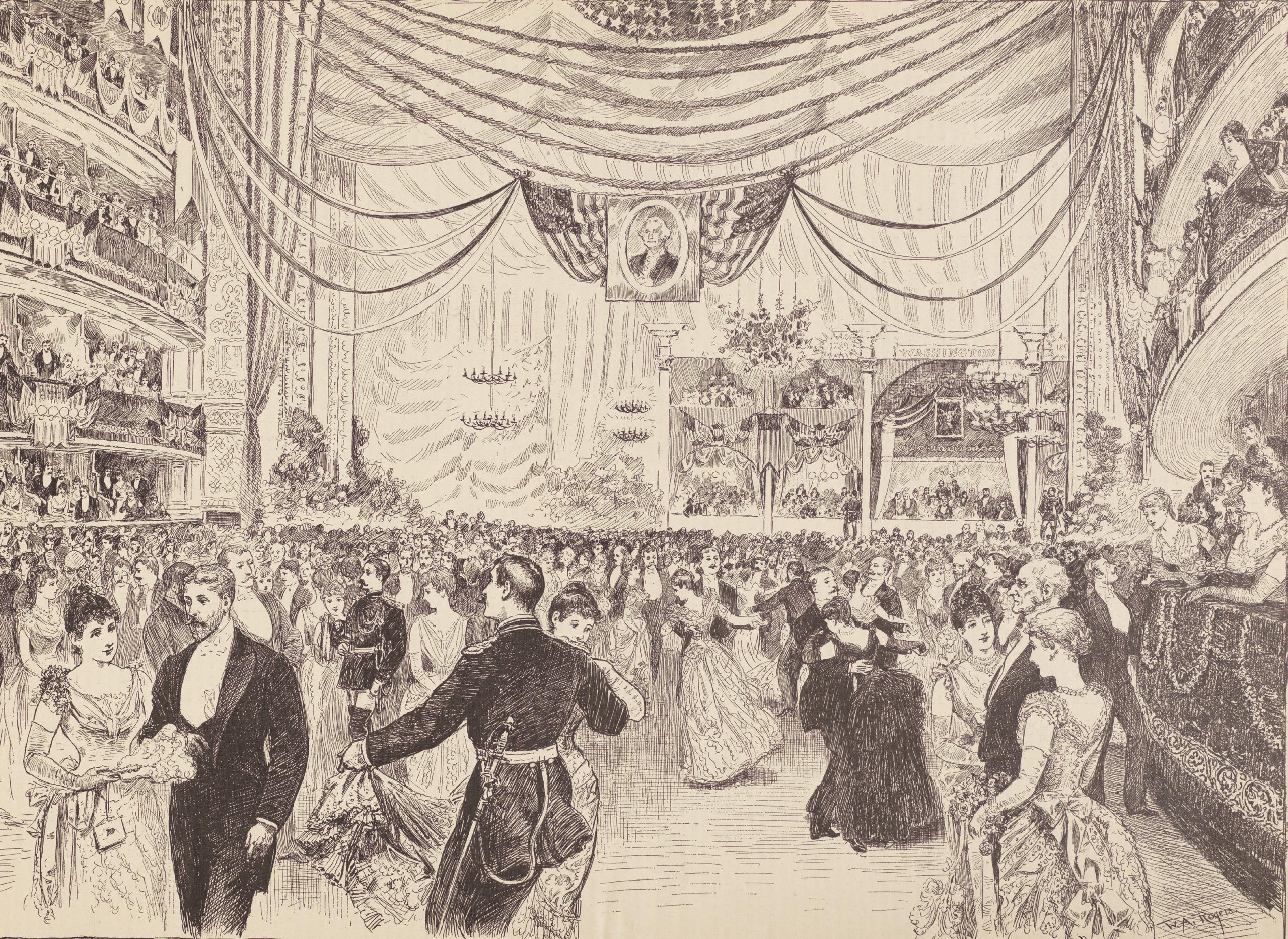 above President Harrison watches the dancing during the centennial ball in the Metropolitan Opera House, as illustrated in the May 11, 1889, of Harper’s Weekly. left
