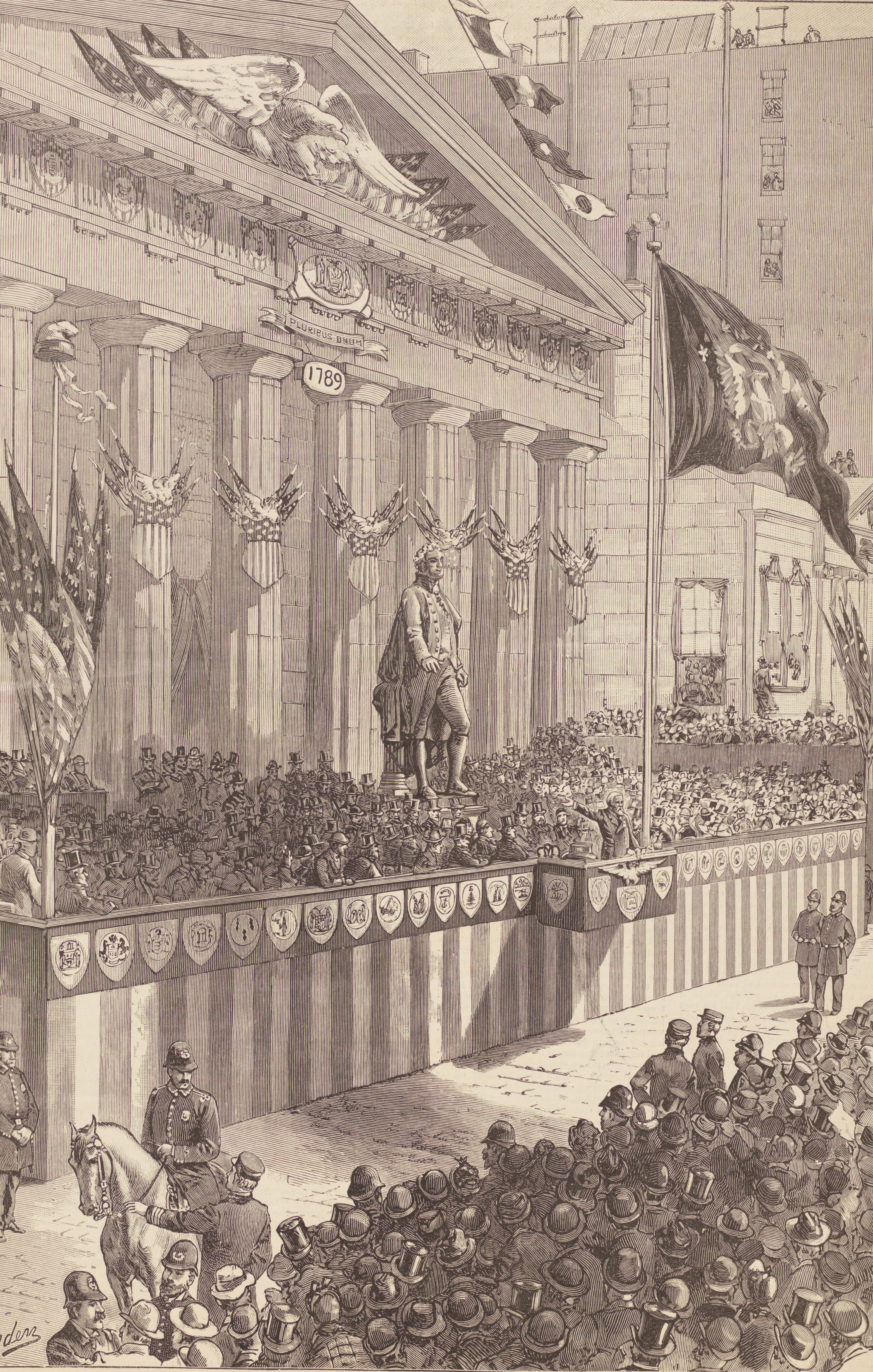 In the middle of the large platform that stretched out from the Sub-Treasury Building stood a huge statue of Washington that was visible behind the speakers.1 First Clarence W. Bowman, a distinguished historian and editor of the publication that recorded the entire centennial, read “The Vow of Washington,” a poem John Greenleaf Whittier had written for the occasion. Then President Benjamin Harrison delivered an address to a crowd of more than ten thousand.