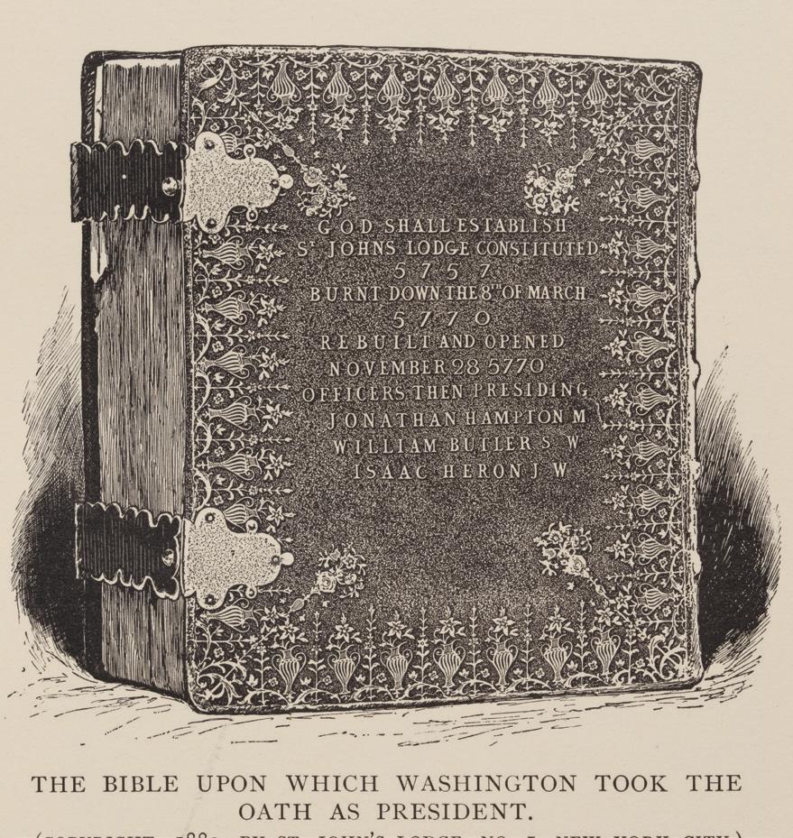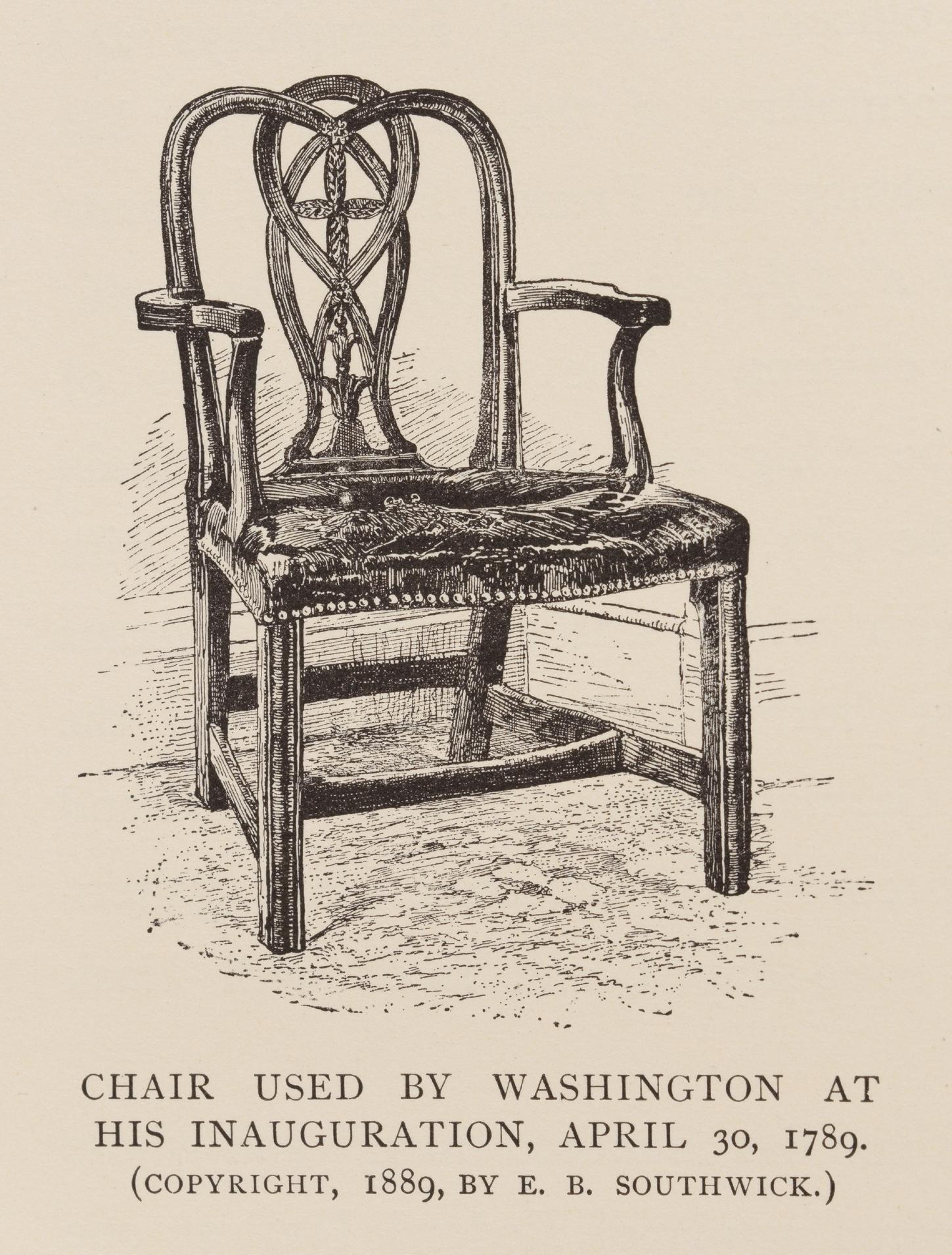 At the SubTreasury Building President Harrison was shown the Bible used by Washington on his Inauguration Day. The Bible continues to be exhibited at times at Federal Hall National Memorial. Harrison was also shown the mahogany chair in which Washington sat before standing to take the Oath of Office. The chair is now in the collection of the New York Historical. ago, with the thirteen stars arranged in a circle, and the other the ancient white silk banner with the royal golden fleur-de-lis of the King of France.”