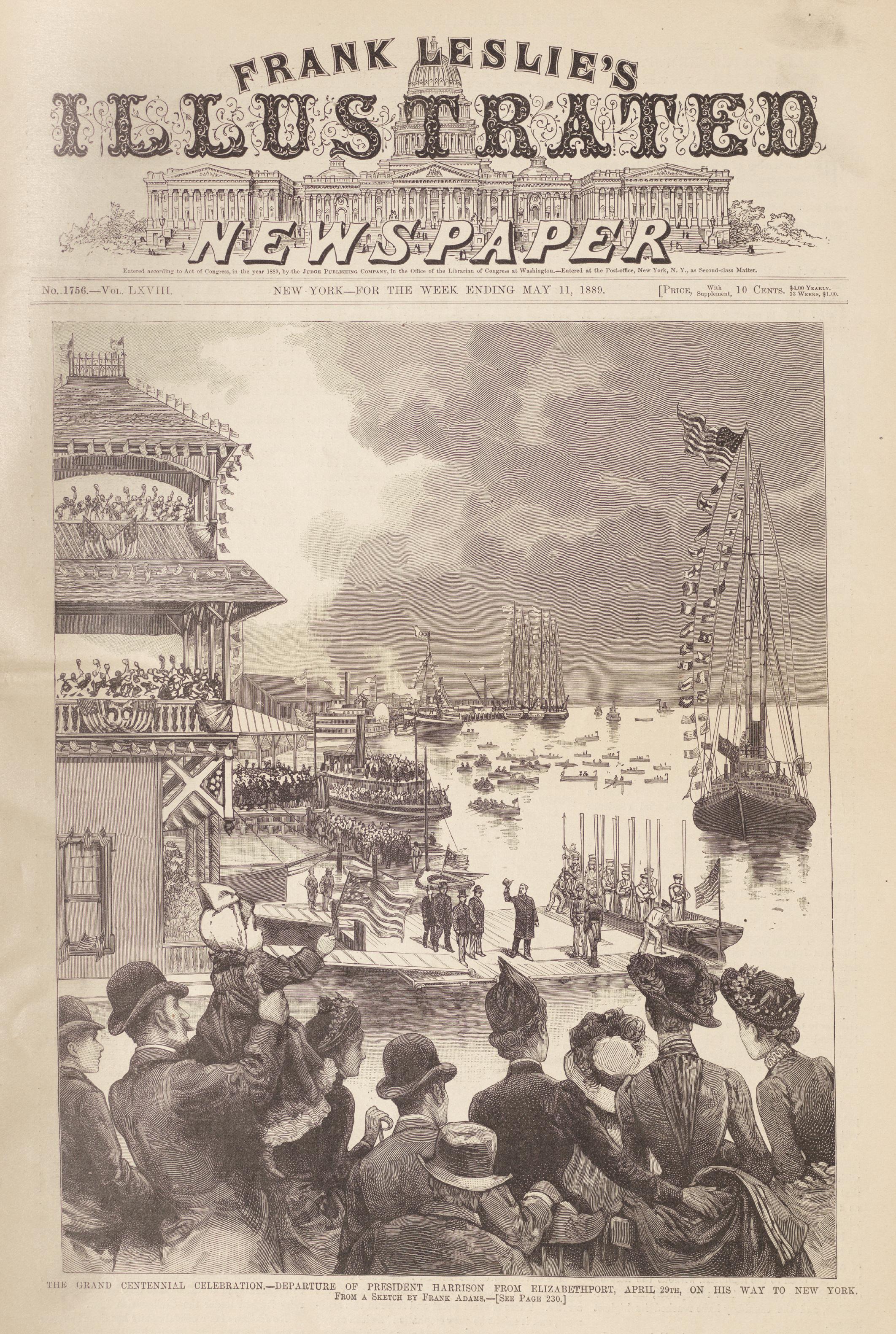 The cover of the May 11, 1889, issue of Frank Leslie’s Illustrated Newspaper features Harrison’s departure from Elizabethport, New Jersey. He waves his hat to the crowd ahead of boarding a barge manned by the Marine Society of the Port of New York, which will carry him to the waiting USS Despatch.