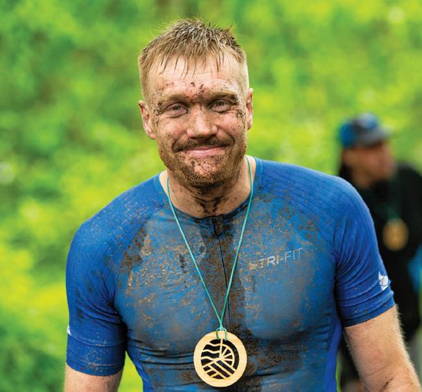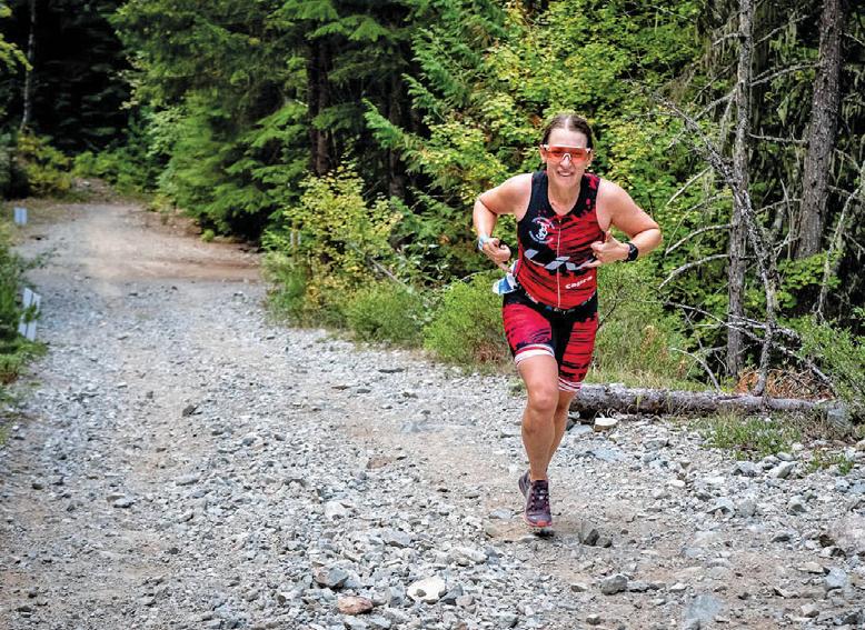 PHOTOS BY OISIN MCHUGH PHOTOGRAPHY Left: Local pro off-road triathlete Christy Drever in the Whistler race; Swimmers at Alice Lake; David Gillespie who raced all tris in 2024