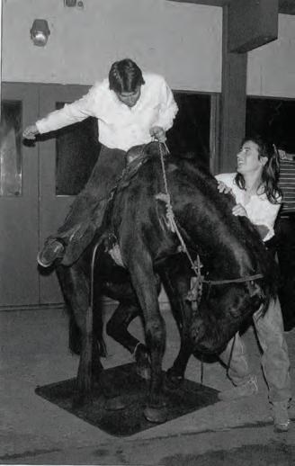 taxidermied bronco—and more importantly, his vintage saddle—during a fundraiser