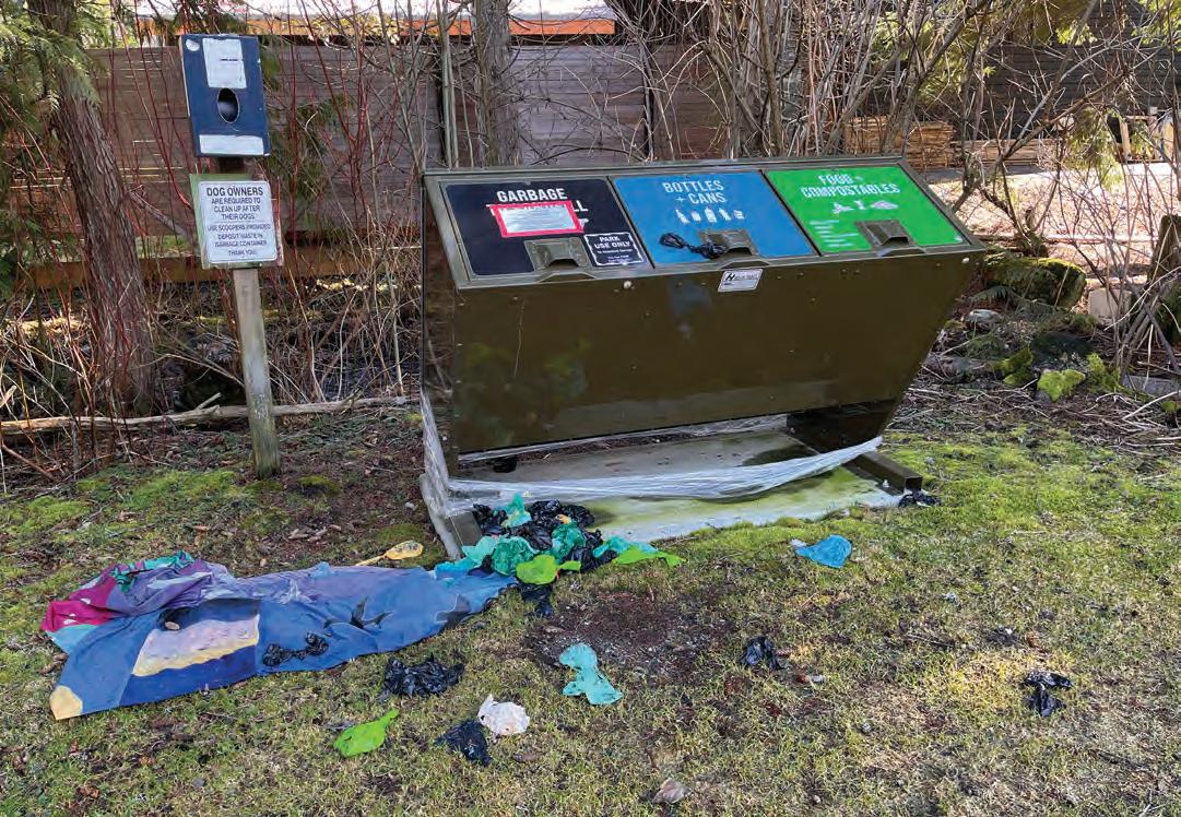 And so it was extra disheartening this weekend to come across one of the “closed” garbage bins on our walking route, with its careful and deliberate wrapping signalling its closure ripped off, and a literal pile of dog poop bags on and all around it (flip to Partial Recall on page 33 for a photo of this lovely sight).