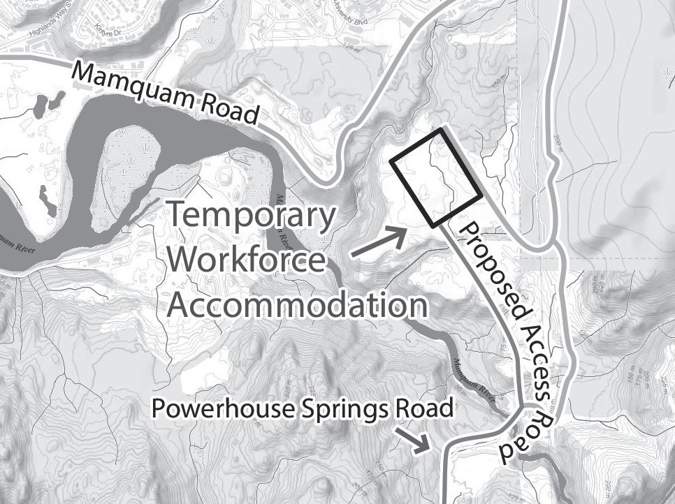 Construction Laydown Yard for personal vehicle parking and the temporary workforce lodge as overflow; shuttles to reduce traffic; upgrading the Mamquam River FSR from Highway 99 to the Powerhouse Springs Road intersection; and collaborating on field signage and opportunities to promote Squamish Canyon when it’s operational.