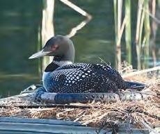 shore. The parents abandoned the nest in the storm, leaving the remaining, no longer viable, egg behind. On May 28, the Cove parents welcomed their first chick, Charlie. The Eagles must have had their eye on the Loon nest, because later that day the Eagles started divebombing the nest, causing the parents and Charlie to abandon the nest and leave the Cove. The second chick never made it. Everyone enjoyed watching Charlie and his parents for the next ten days, until he ultimately was taken by a predator. The Cove parents ran out of time to renest. The Peninsula parents successfully renested, after surviving a challenge from a younger male. Unfortunately, predators, most likely Herons, destroyed both eggs. The third pair, often spotted near the Birchwood shore, did not take to the Birchwood nest. It may take one more year. The hat trick hatch that we had hoped for was not meant to be. Despite the emptiness of not having chicks to follow, the remaining Loons managed to entertain and delight observers with their water dances, courtship antics, territorial squabbles, and acrobatics. We welcomed several juveniles