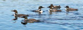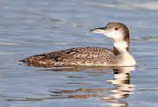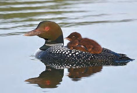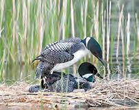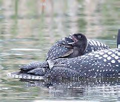 shore. The parents abandoned the nest in the storm, leaving the remaining, no longer viable, egg behind. On May 28, the Cove parents welcomed their first chick, Charlie. The Eagles must have had their eye on the Loon nest, because later that day the Eagles started divebombing the nest, causing the parents and Charlie to abandon the nest and leave the Cove. The second chick never made it. Everyone enjoyed watching Charlie and his parents for the next ten days, until he ultimately was taken by a predator. The Cove parents ran out of time to renest. The Peninsula parents successfully renested, after surviving a challenge from a younger male. Unfortunately, predators, most likely Herons, destroyed both eggs. The third pair, often spotted near the Birchwood shore, did not take to the Birchwood nest. It may take one more year. The hat trick hatch that we had hoped for was not meant to be. Despite the emptiness of not having chicks to follow, the remaining Loons managed to entertain and delight observers with their water dances, courtship antics, territorial squabbles, and acrobatics. We welcomed several juveniles