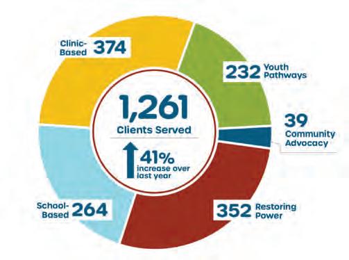 For the 1,261 individuals served, 374 received clinic-based therapy, 264 received school-based therapy, 352 revolved around restoring power, 232 interactions were for youth pathways (diversion and community connections) and 39 were community advocacy-based. The top three diagnoses treated were generalized anxiety disorder, post-traumatic stress disorder and major depressive disorder.