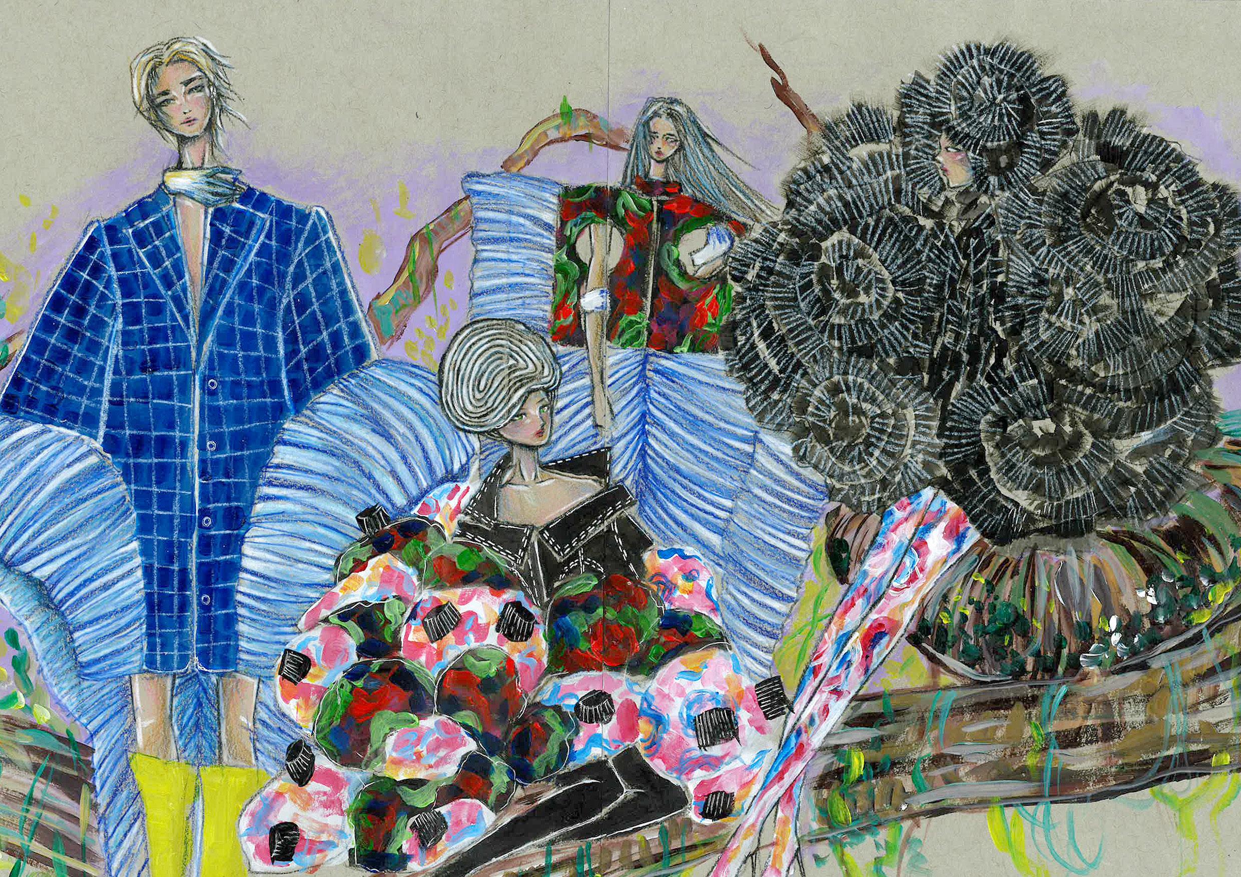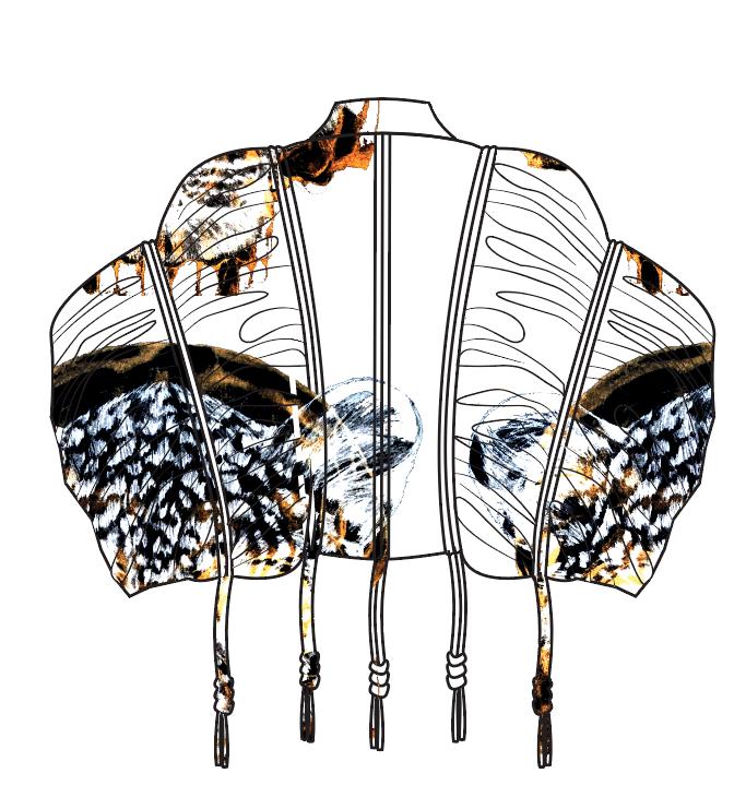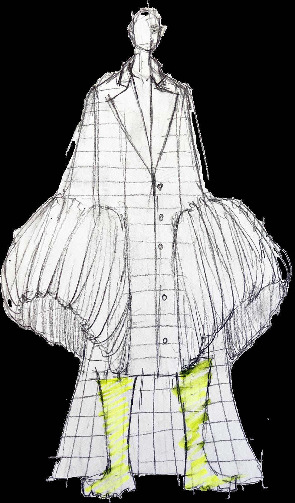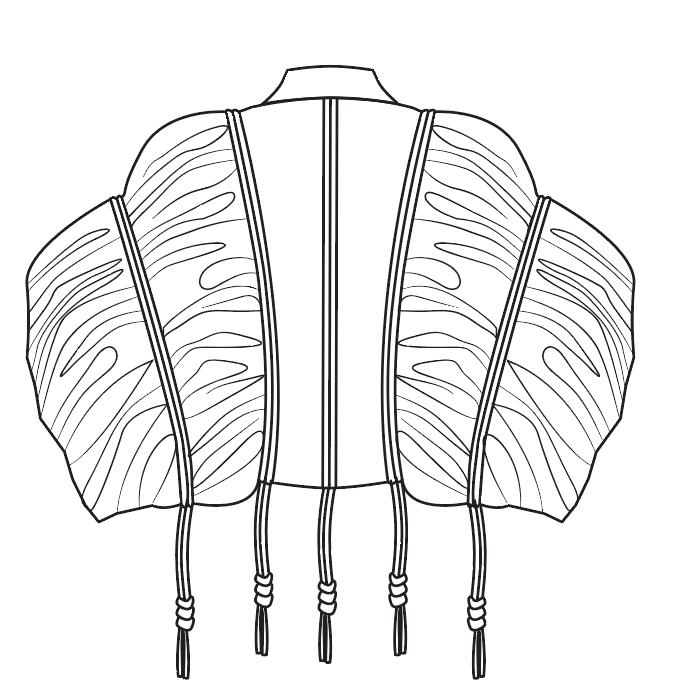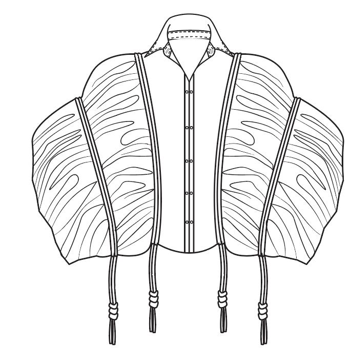 The shape of the coat represents the look of shrubs or flower petals, while the sleeves openings represent the bite marks left by caterpillars.