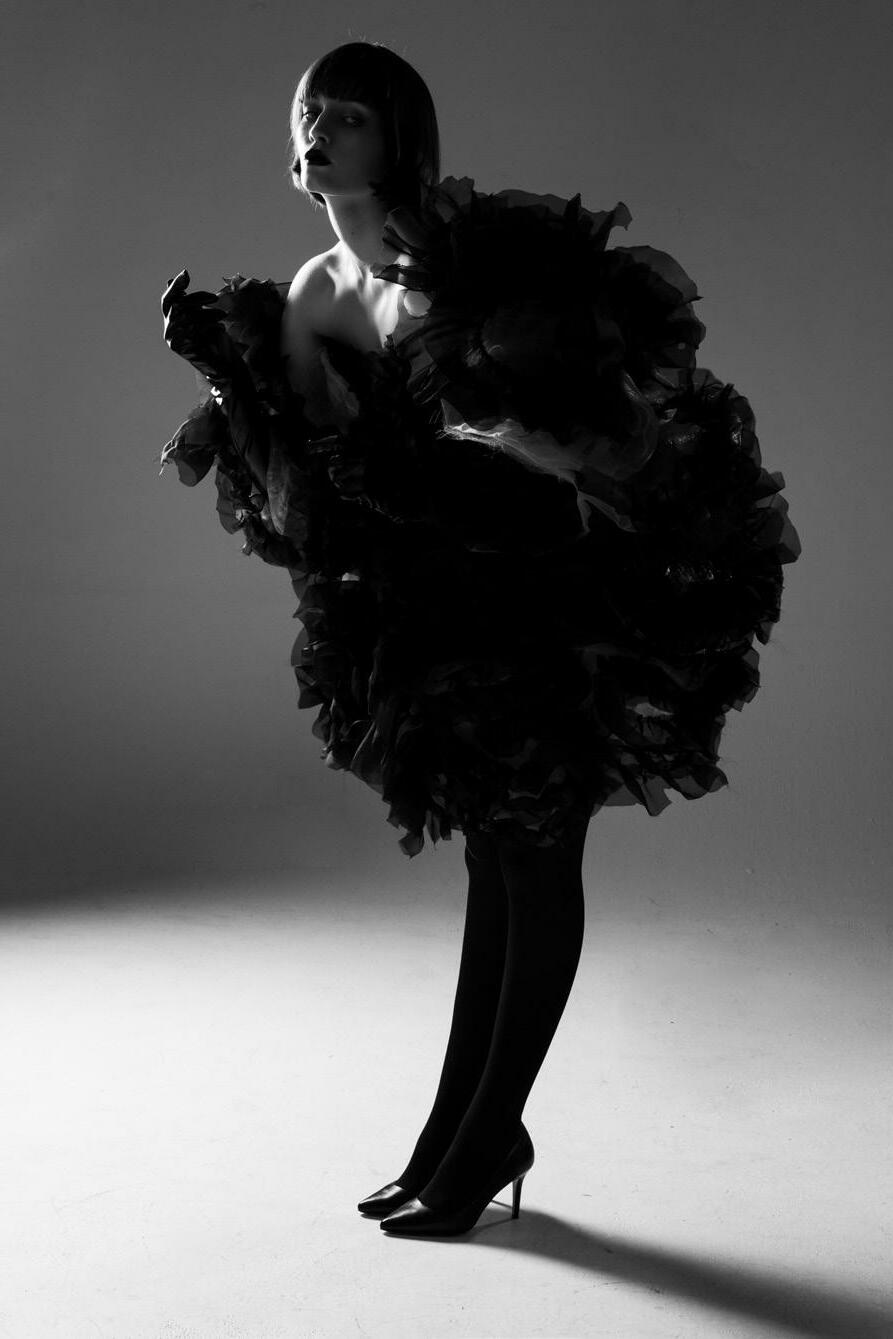 This sculptural look is made by shaping crinoline nets into circles and sewn together to create the silhoutte. 10 metres of silk organza in black are cut into strip, and gathered into ruffles. These ruffles are then hand-sewn onto the crinoline base.