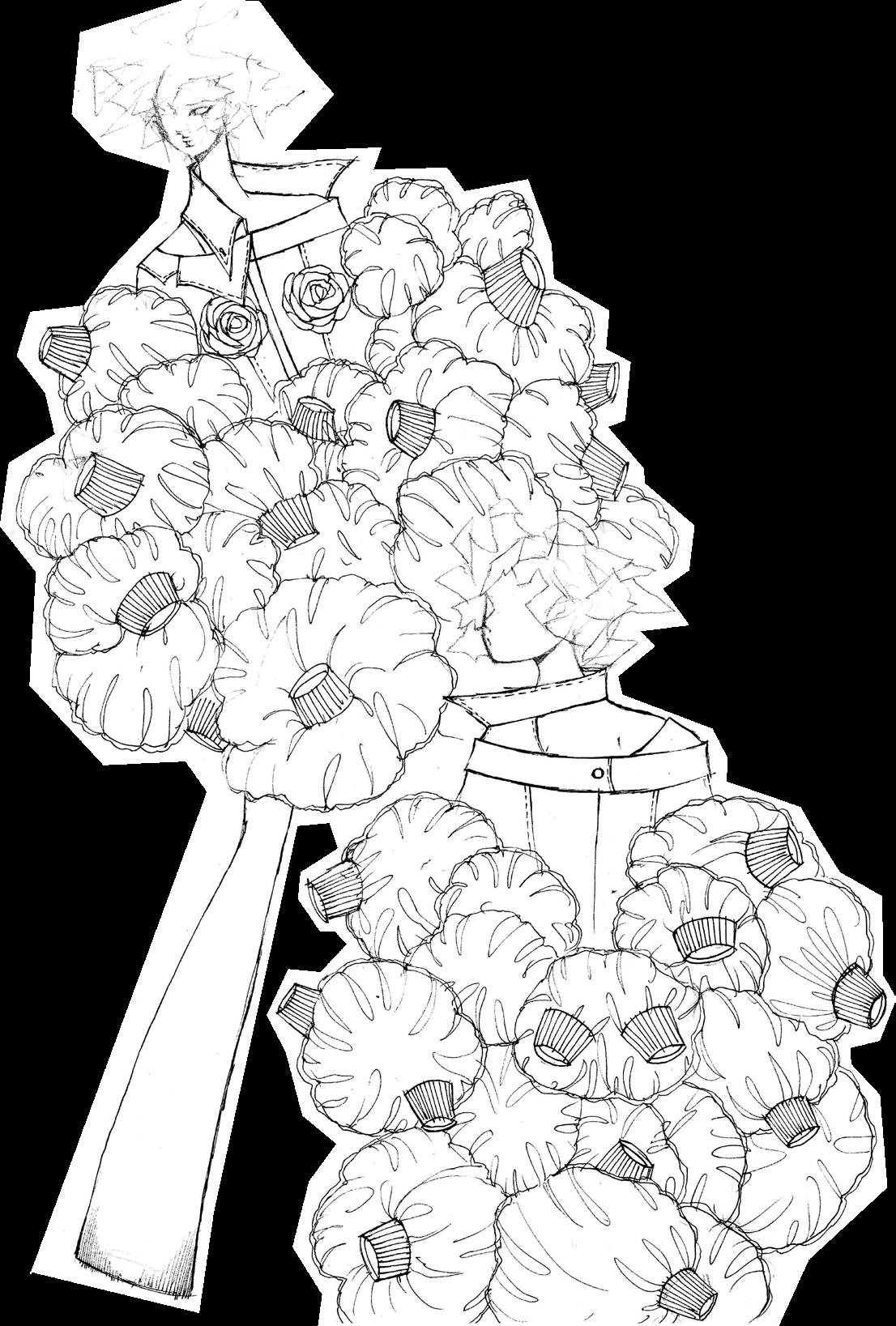 is a take on tailored cape with lapel collars. This look is a continuation of look 1, in a sense, as it continues the cycle of life. ‘Forms’ represents a budding flower.