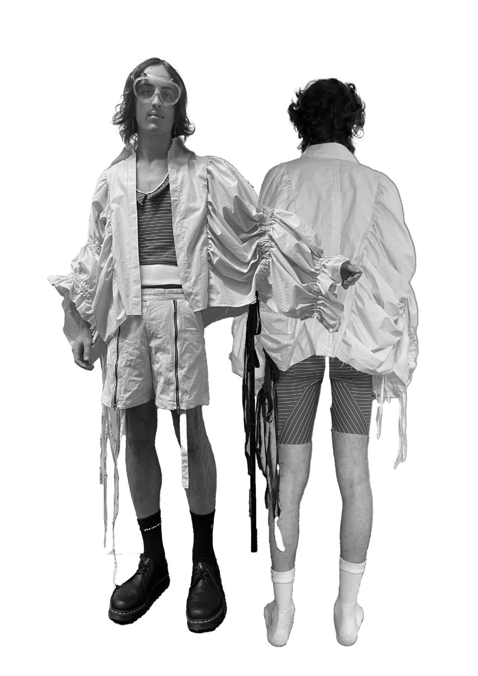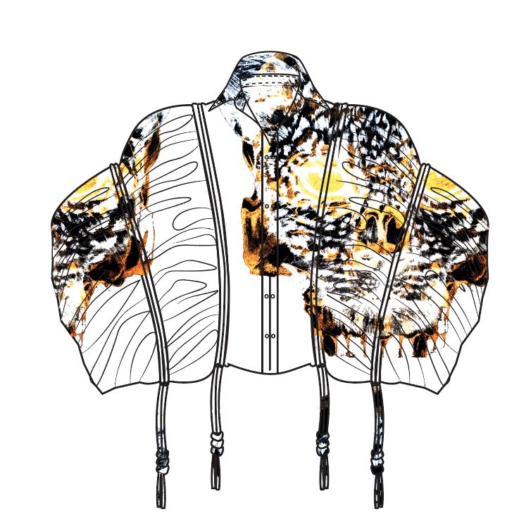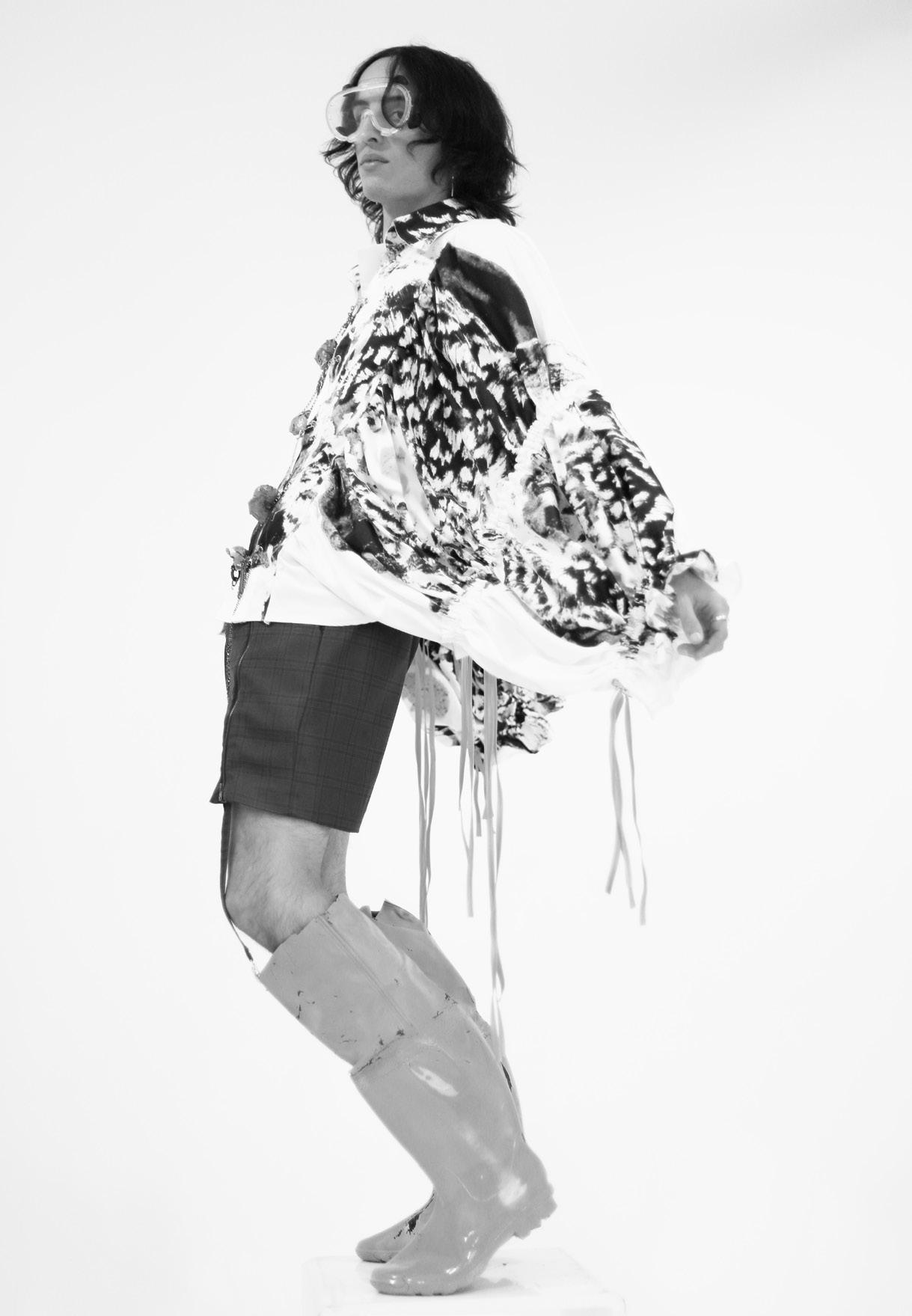 scatters is inspired by honey bees and the polination of flowers. The silhoutte is a take on traditional menswear shirt that is deconstructed into a winged shirt. Sleeves are removed and replaced with sections of gathered parts. These gathered parts form the ‘wings’.