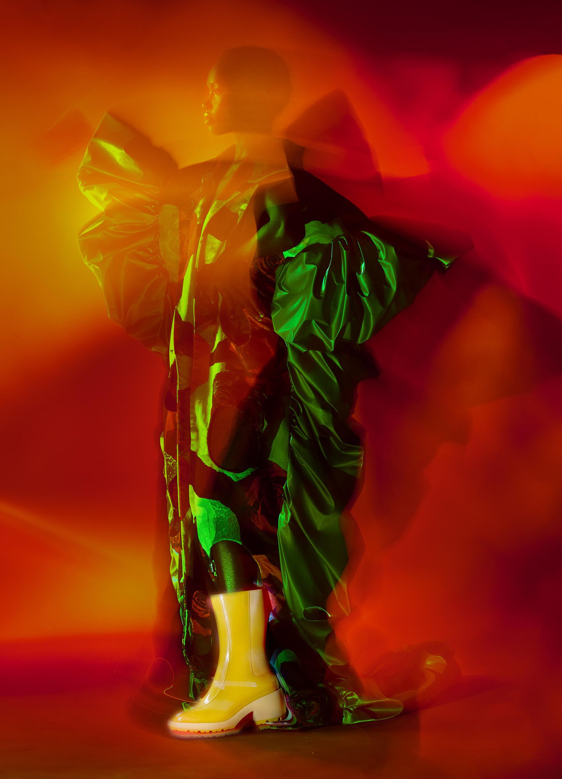 LICFW subverts the design principle “Form Follows Function”, and suggests that ‘Function Follows Form”. This is done through the deliberate removal of traditional garment aspects such as armholes, sleeves, and openings, as well as disregarding proportions and fit. The wearer, while wearing the garment, is seemingly distorting their anatomy, thus embraces the design unapologetically.