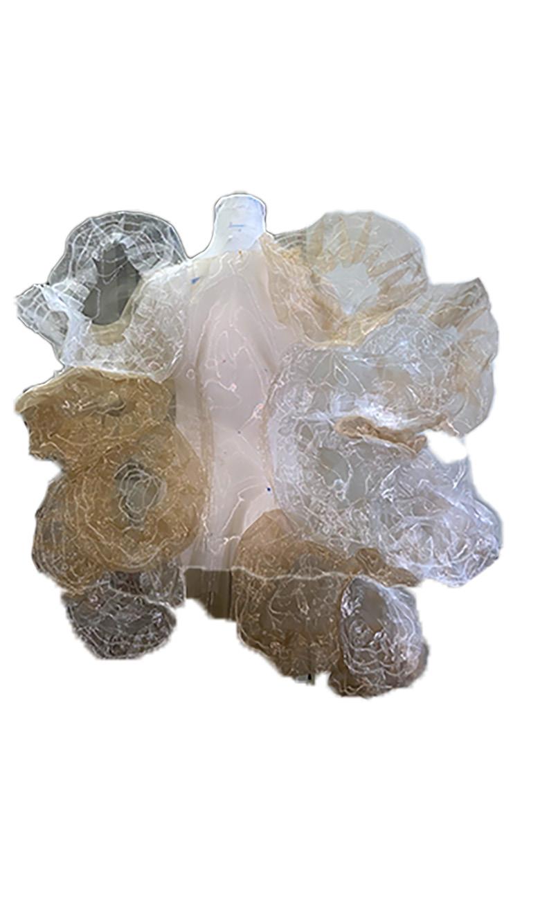 The transparency of the organza reveals the cream and white crinoline base. This reflects the network of veins on leaves under sunlight.