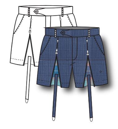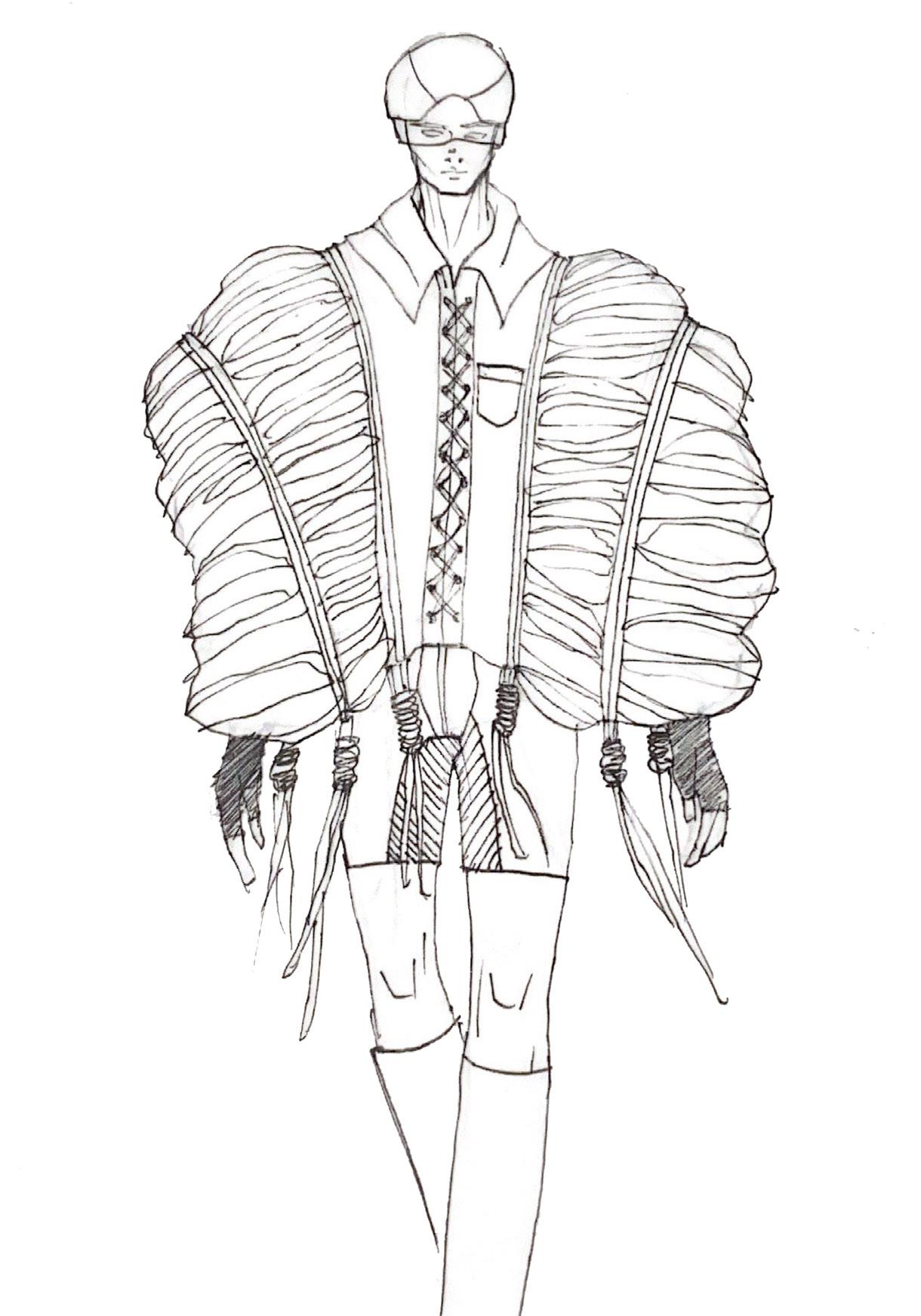 Dropped sleeves is done deliberately to continue the distortion aspect of the collection. The ‘buds’ are placed strategically lower than where the arms rest, as if dragging the cape. Openings for the arms are done through the use of exposed zip, this zip feature is continued through to the pants design.