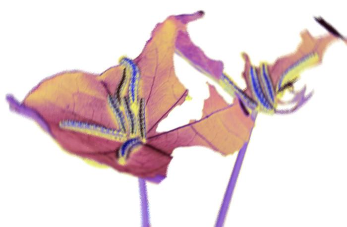 Raw edges are done purposely to mimic the brittleness of decaying petals. Some of the organza ruffles are lit on fire to create a dramatic burnt edges effect, to further create the decaying look.