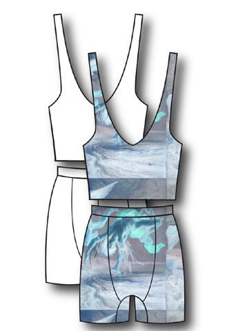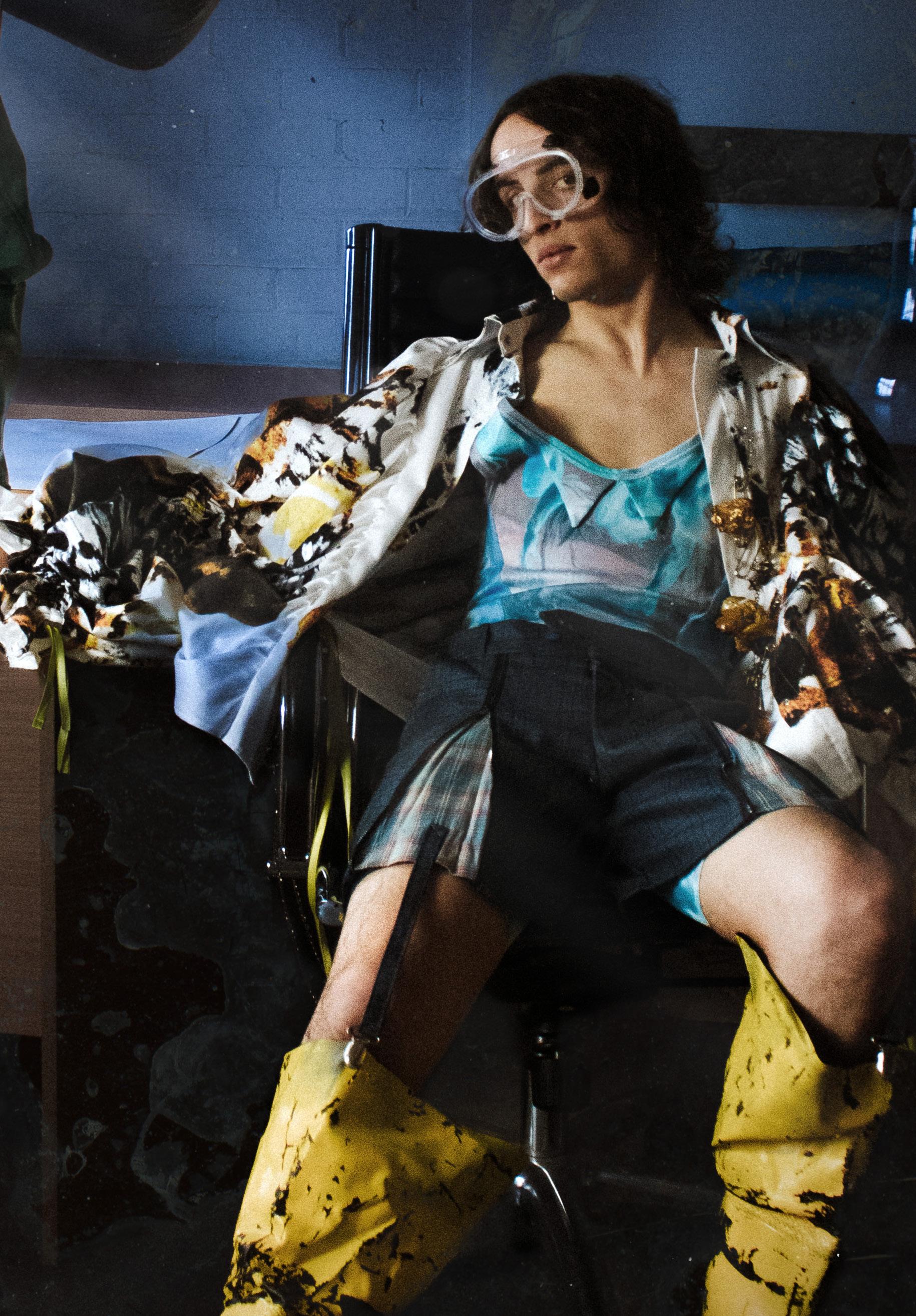 The shirt is paired with 1960s inspired swimsuit with prints taken from painting of ‘Fall of Icarus’ by Jacob Peter Gowy.