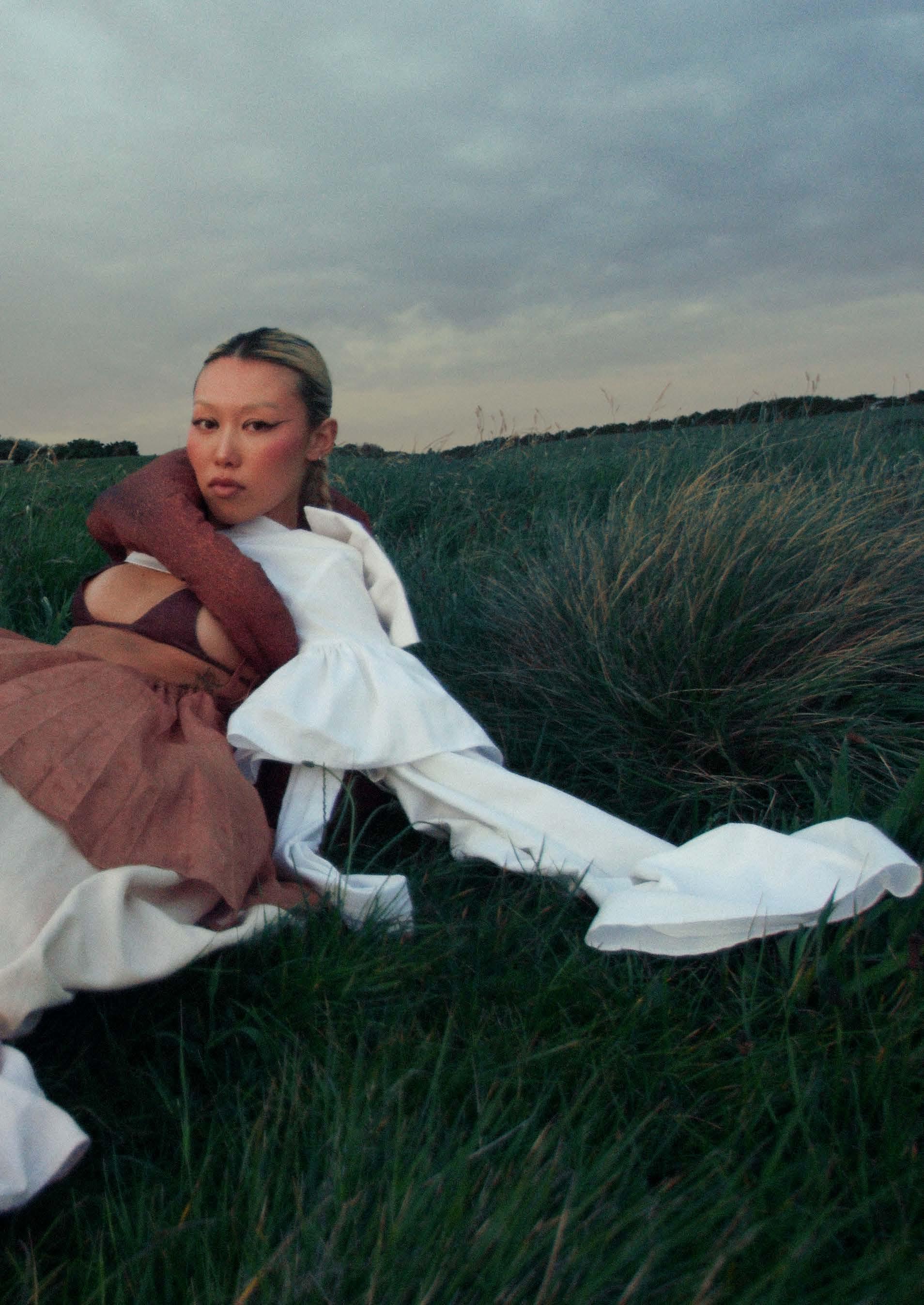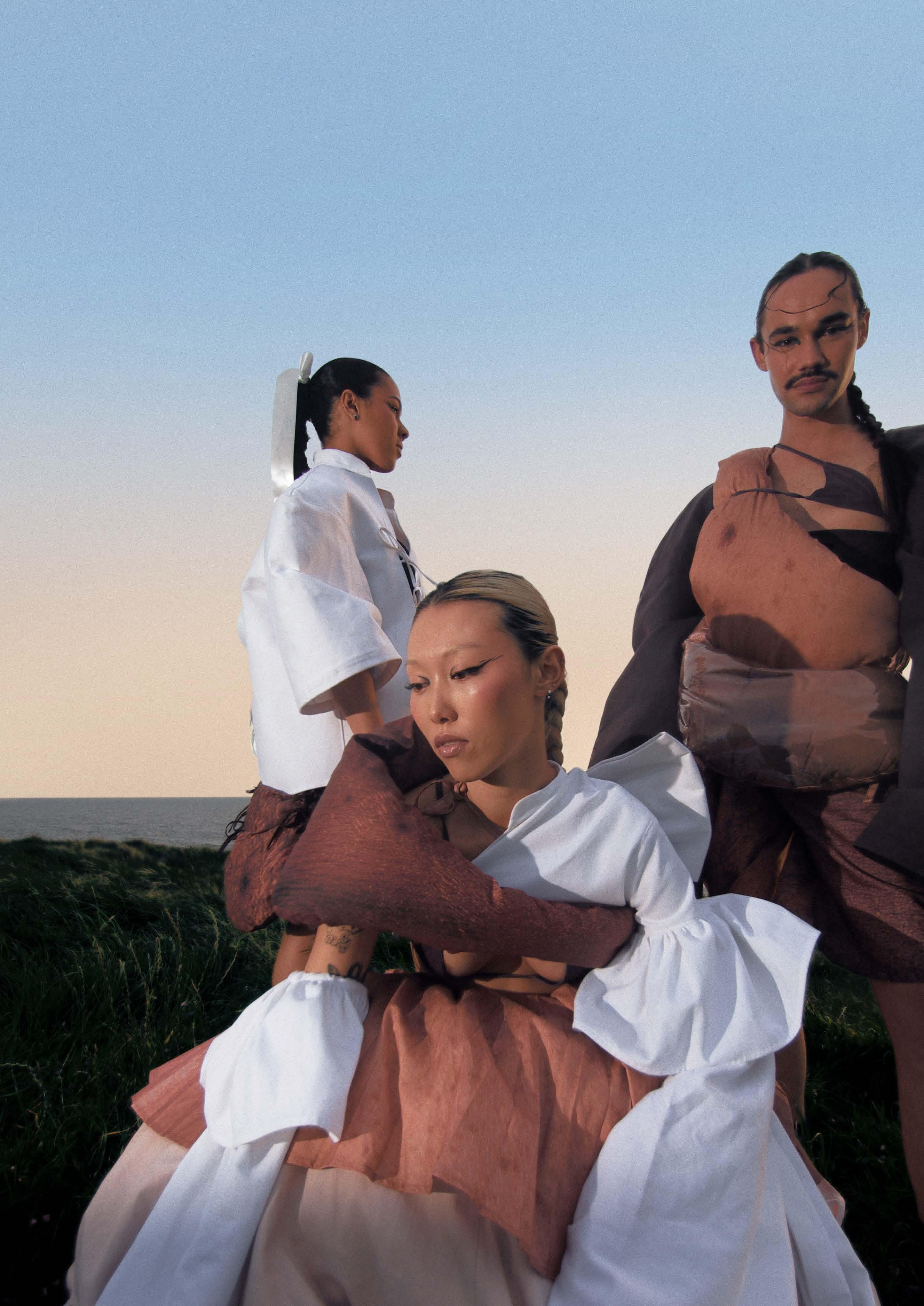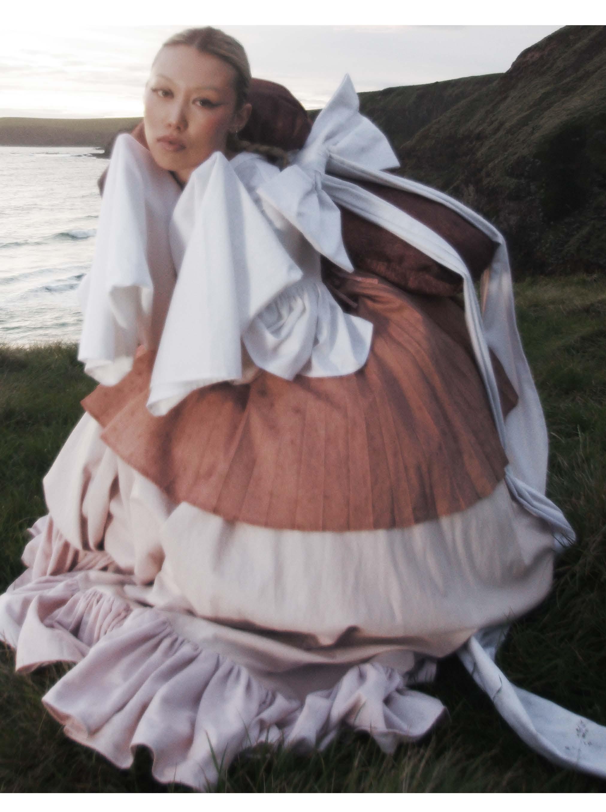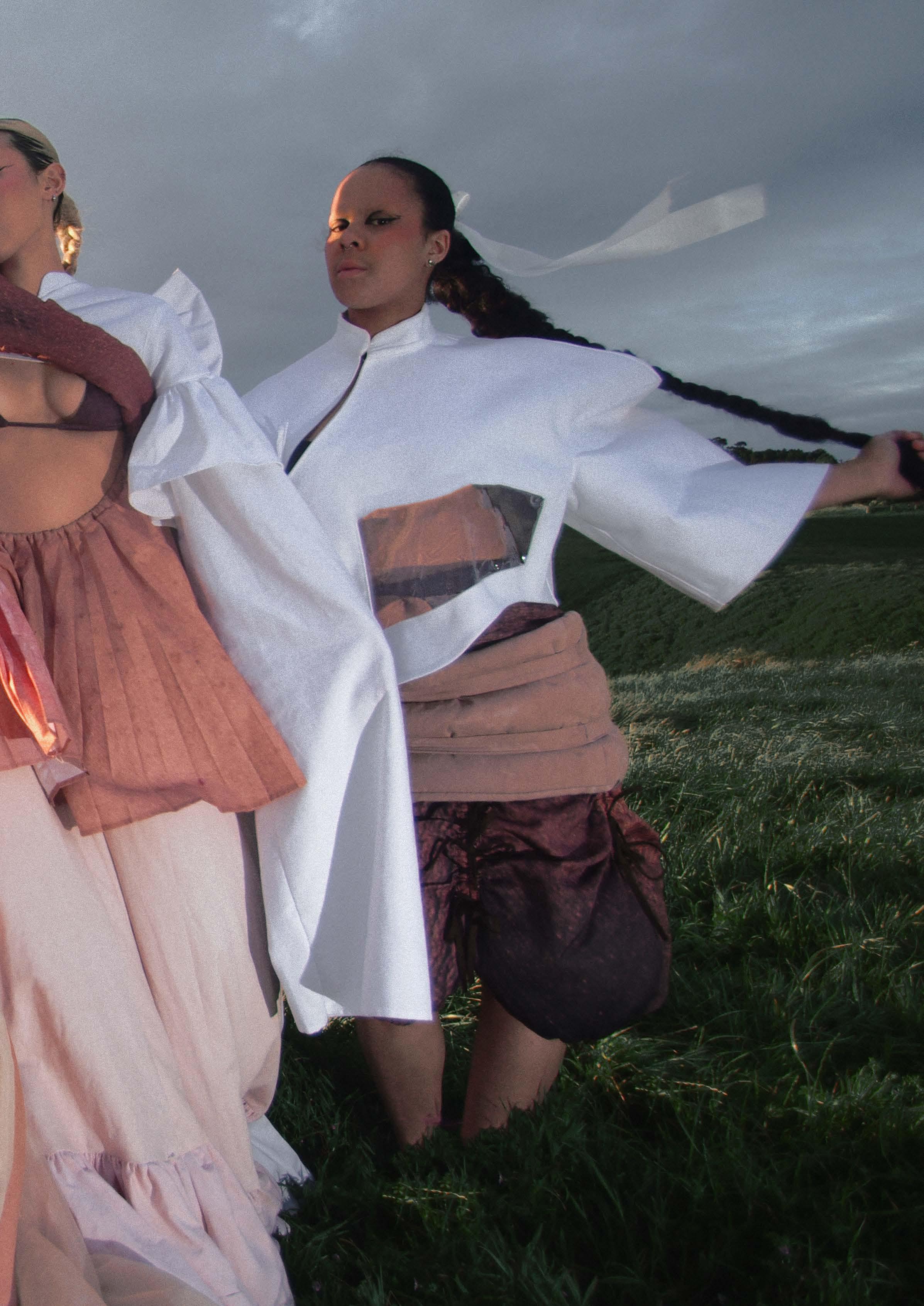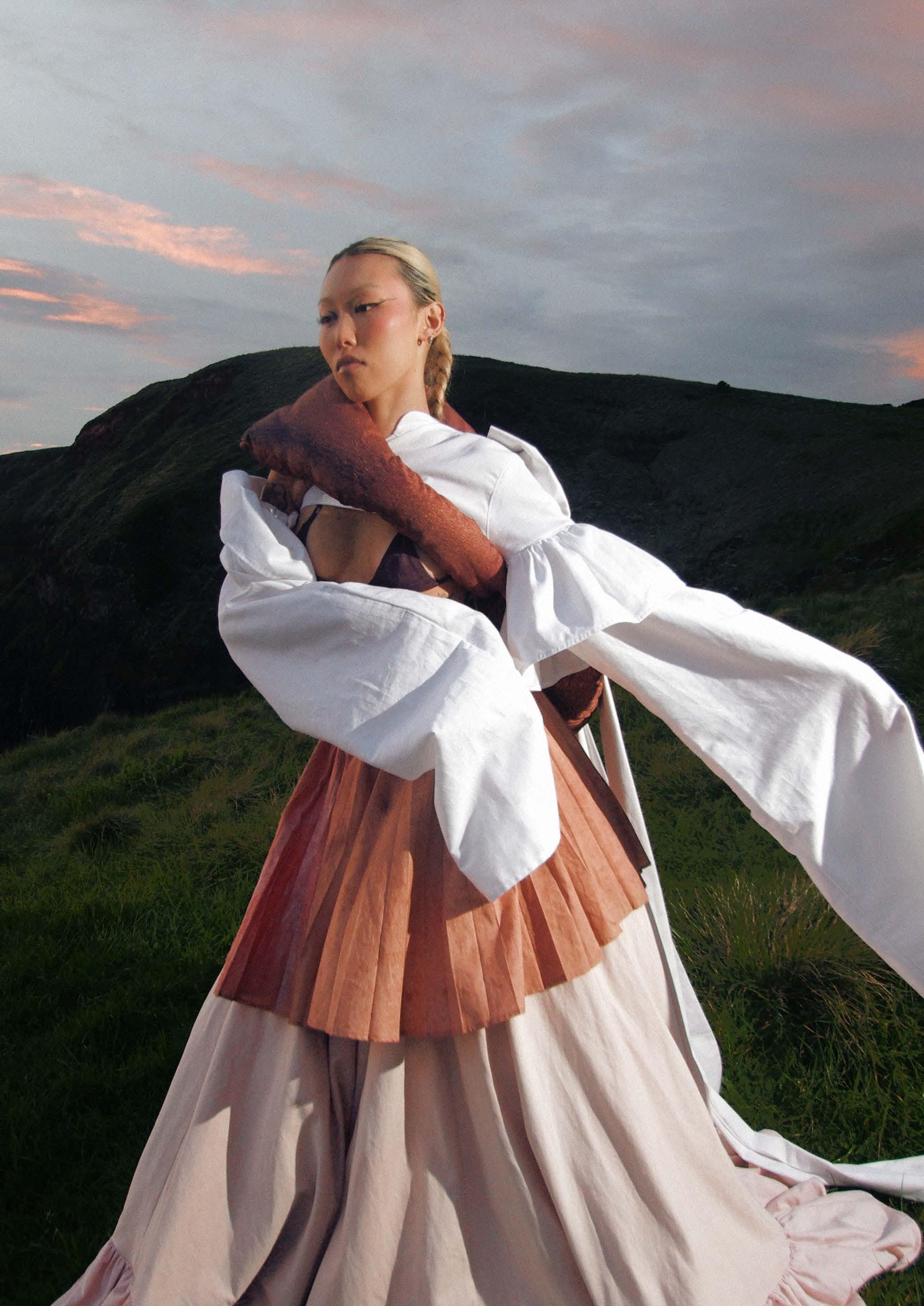 The colour palette is drawn from the hues of skin featuring muted analogous pink/red/orange tones with a discordal pale mint. Texture is explored visually through the prints of skin onto fabric but also physically through the pleats which come out from underneath the other garments.